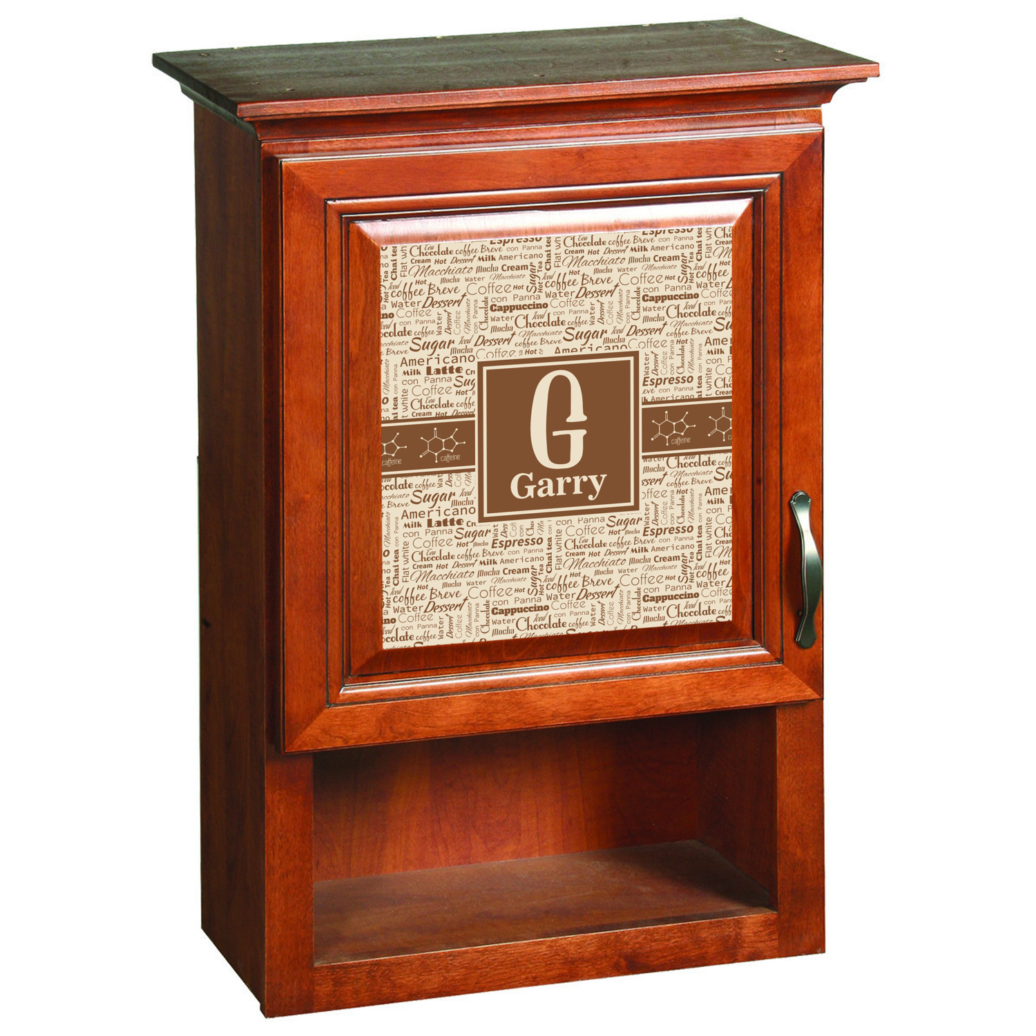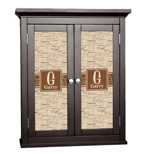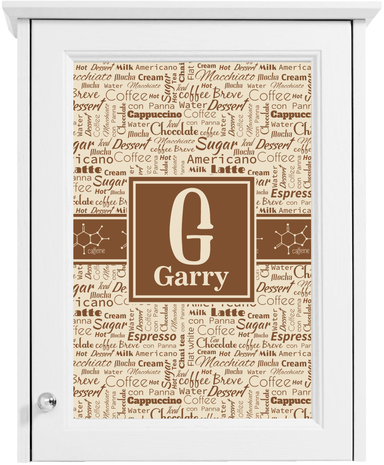 This design has a fun word cloud background with words like macchiato, sugar, coffee, latte, americano, and more. The colors are a light cream and chocolate brown. In the center is a frame where you are able to add personalization. The ribbon behind the frame has the chemical symbol for caffiene.