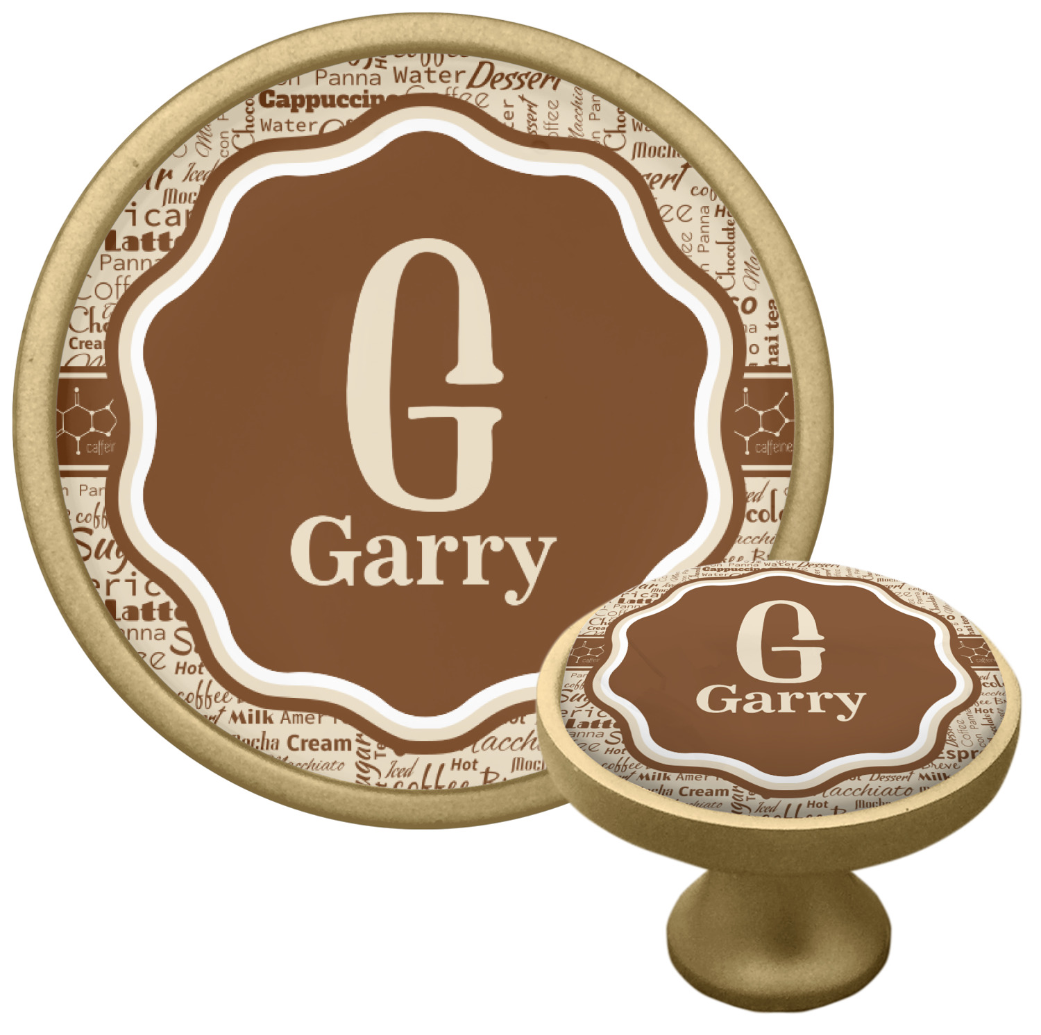 This design has a fun word cloud background with words like macchiato, sugar, coffee, latte, americano, and more. The colors are a light cream and chocolate brown. In the center is a frame where you are able to add personalization. The ribbon behind the frame has the chemical symbol for caffiene.