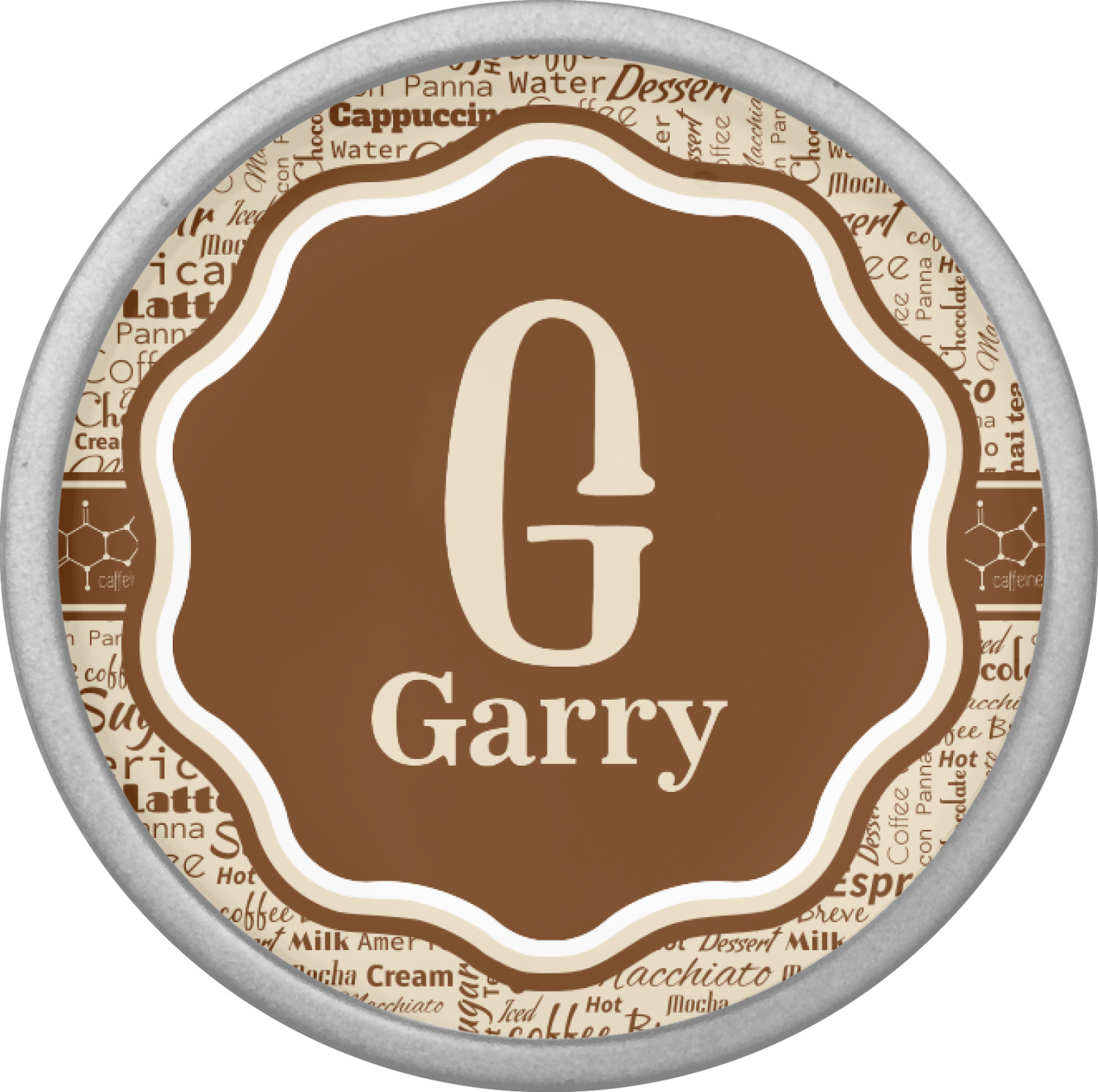 This design has a fun word cloud background with words like macchiato, sugar, coffee, latte, americano, and more. The colors are a light cream and chocolate brown. In the center is a frame where you are able to add personalization. The ribbon behind the frame has the chemical symbol for caffiene.