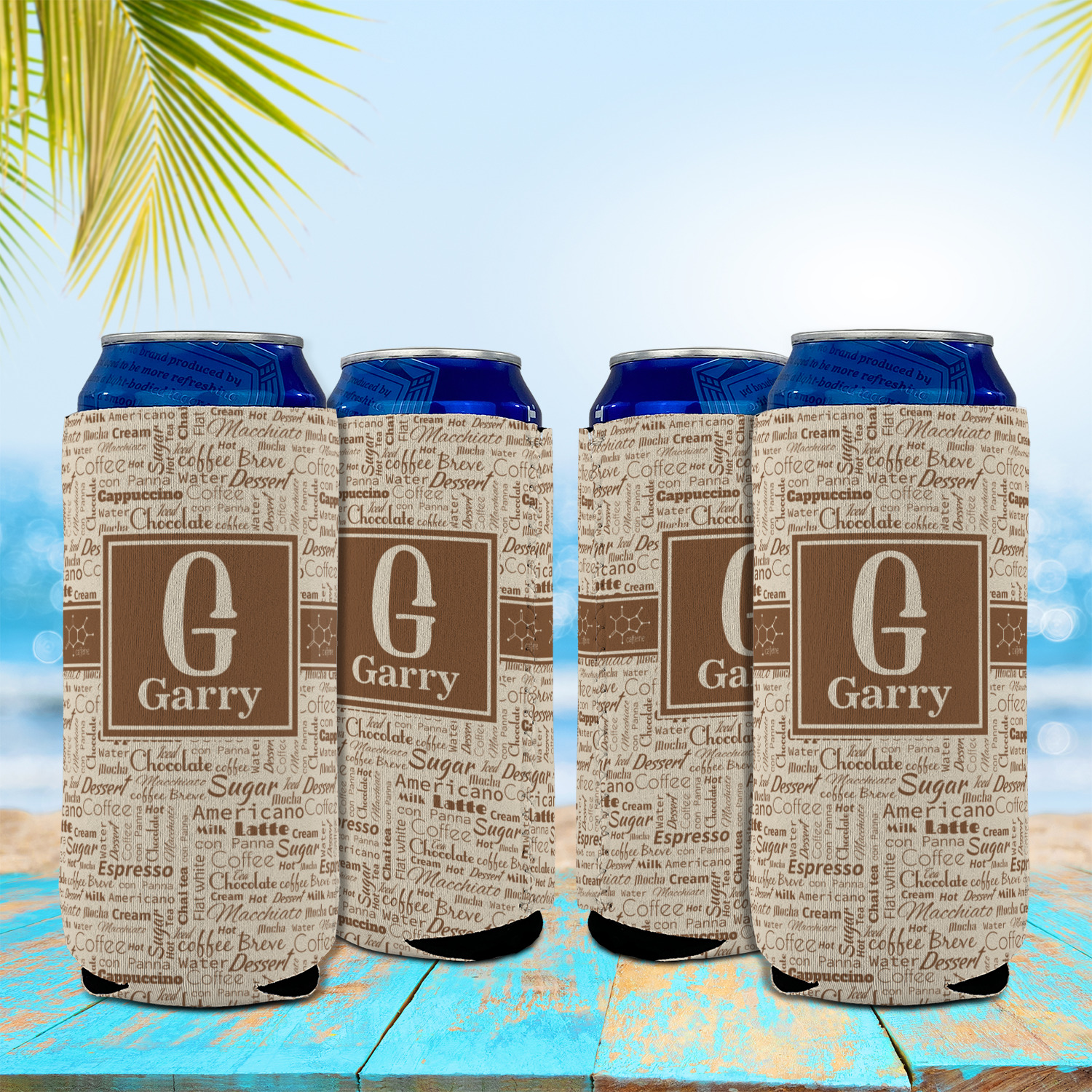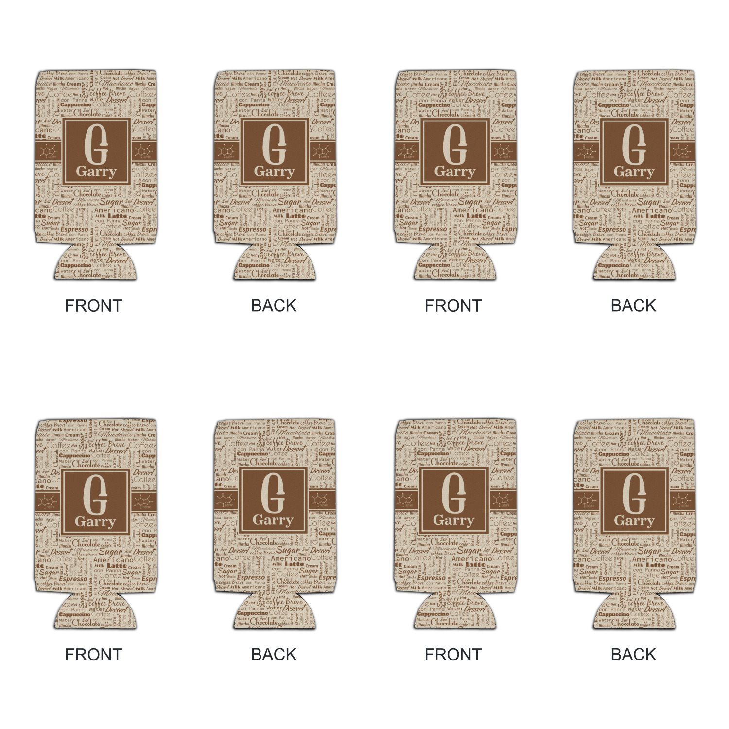 This design has a fun word cloud background with words like macchiato, sugar, coffee, latte, americano, and more. The colors are a light cream and chocolate brown. In the center is a frame where you are able to add personalization. The ribbon behind the frame has the chemical symbol for caffiene.