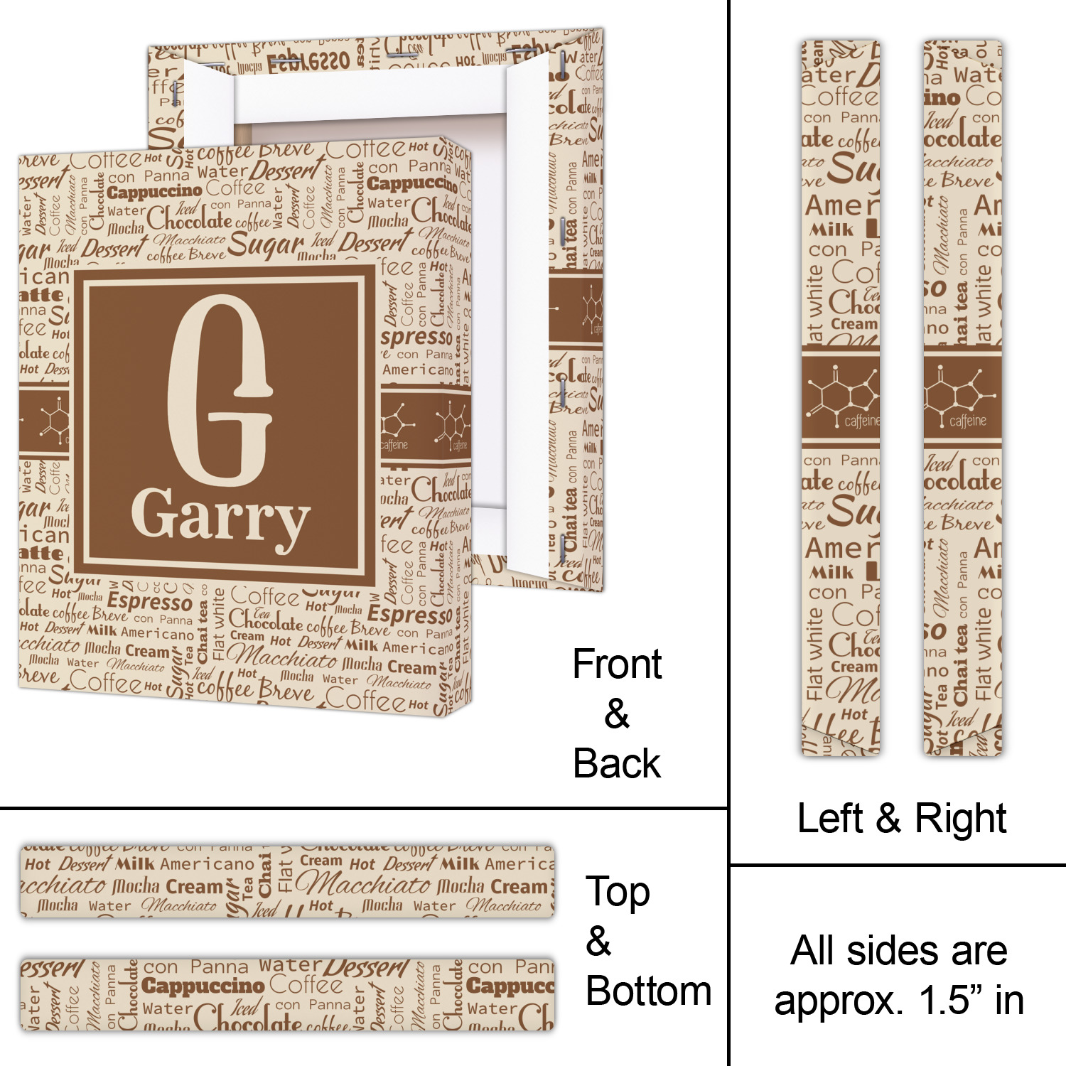 This design has a fun word cloud background with words like macchiato, sugar, coffee, latte, americano, and more. The colors are a light cream and chocolate brown. In the center is a frame where you are able to add personalization. The ribbon behind the frame has the chemical symbol for caffiene.