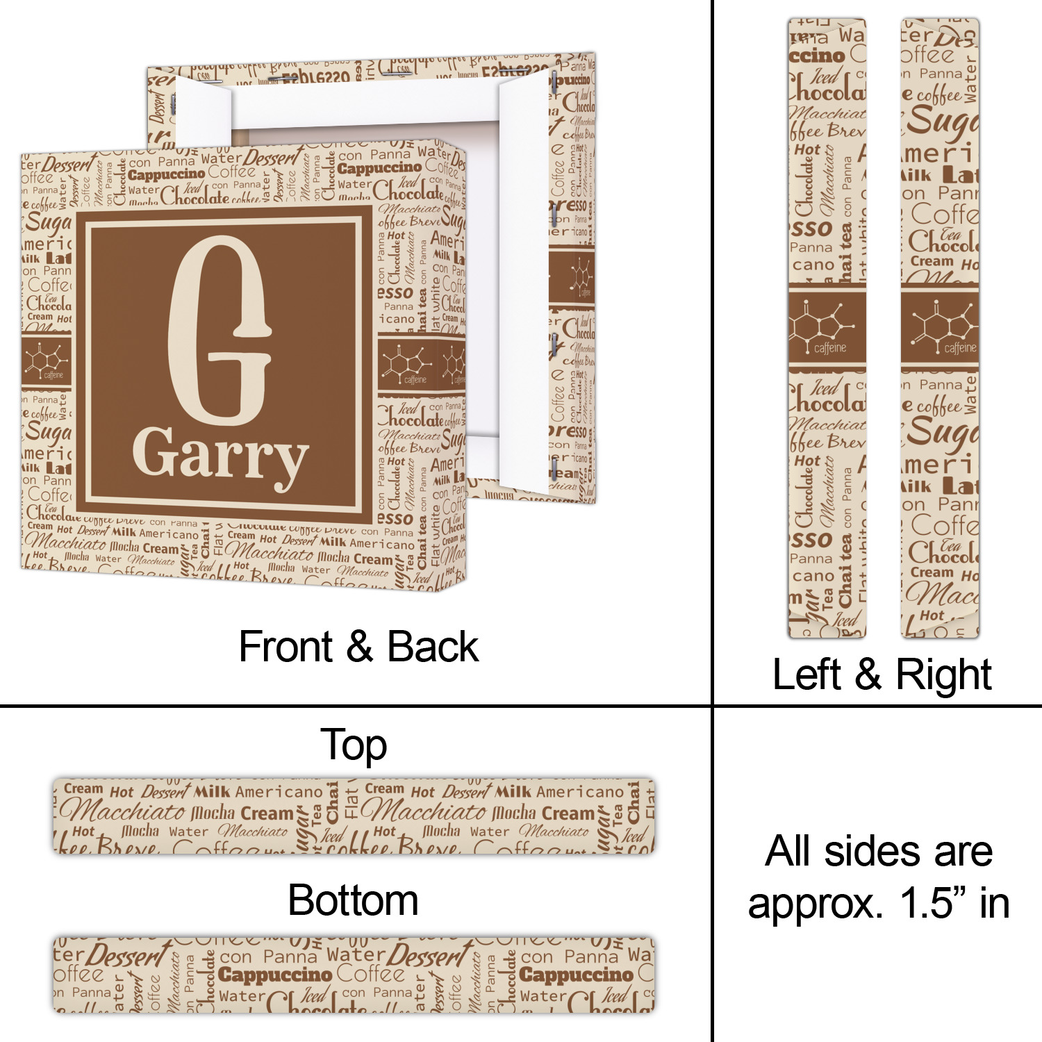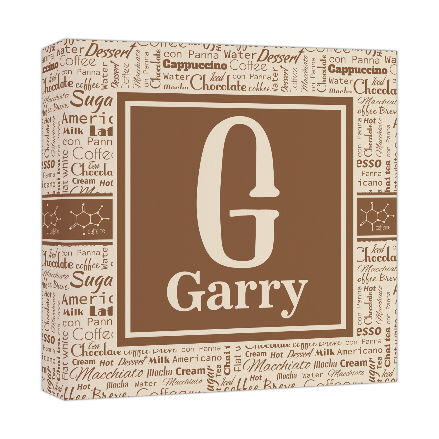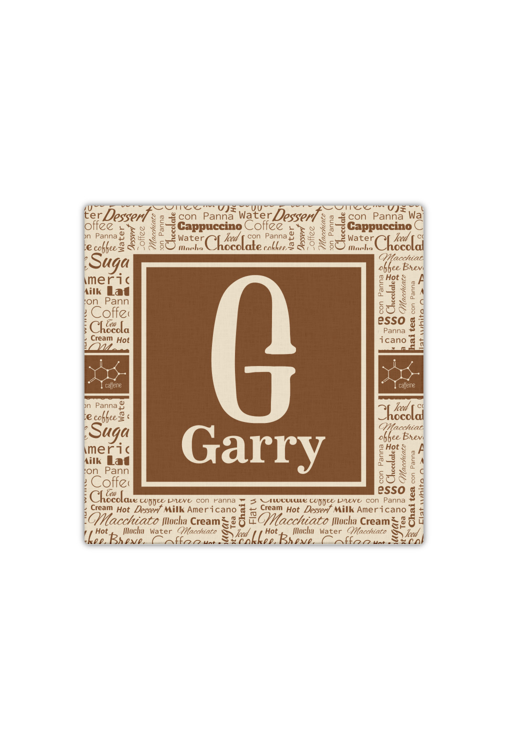 This design has a fun word cloud background with words like macchiato, sugar, coffee, latte, americano, and more. The colors are a light cream and chocolate brown. In the center is a frame where you are able to add personalization. The ribbon behind the frame has the chemical symbol for caffiene.