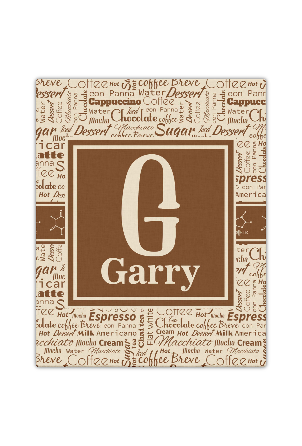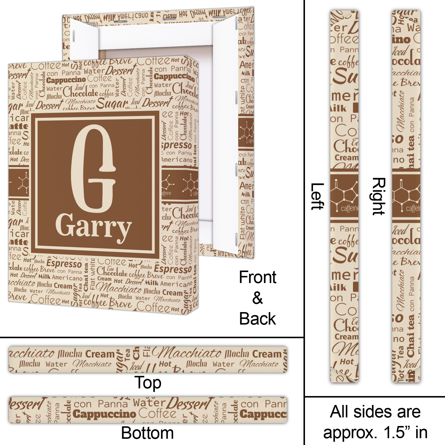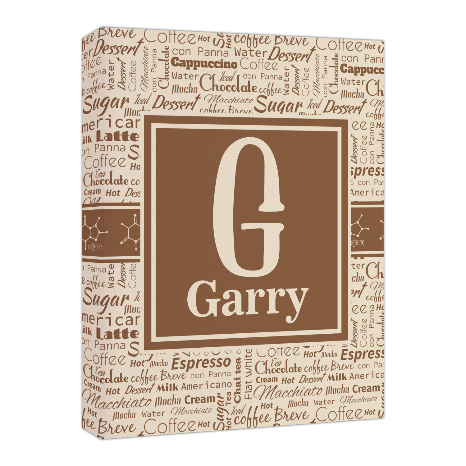 This design has a fun word cloud background with words like macchiato, sugar, coffee, latte, americano, and more. The colors are a light cream and chocolate brown. In the center is a frame where you are able to add personalization. The ribbon behind the frame has the chemical symbol for caffiene.