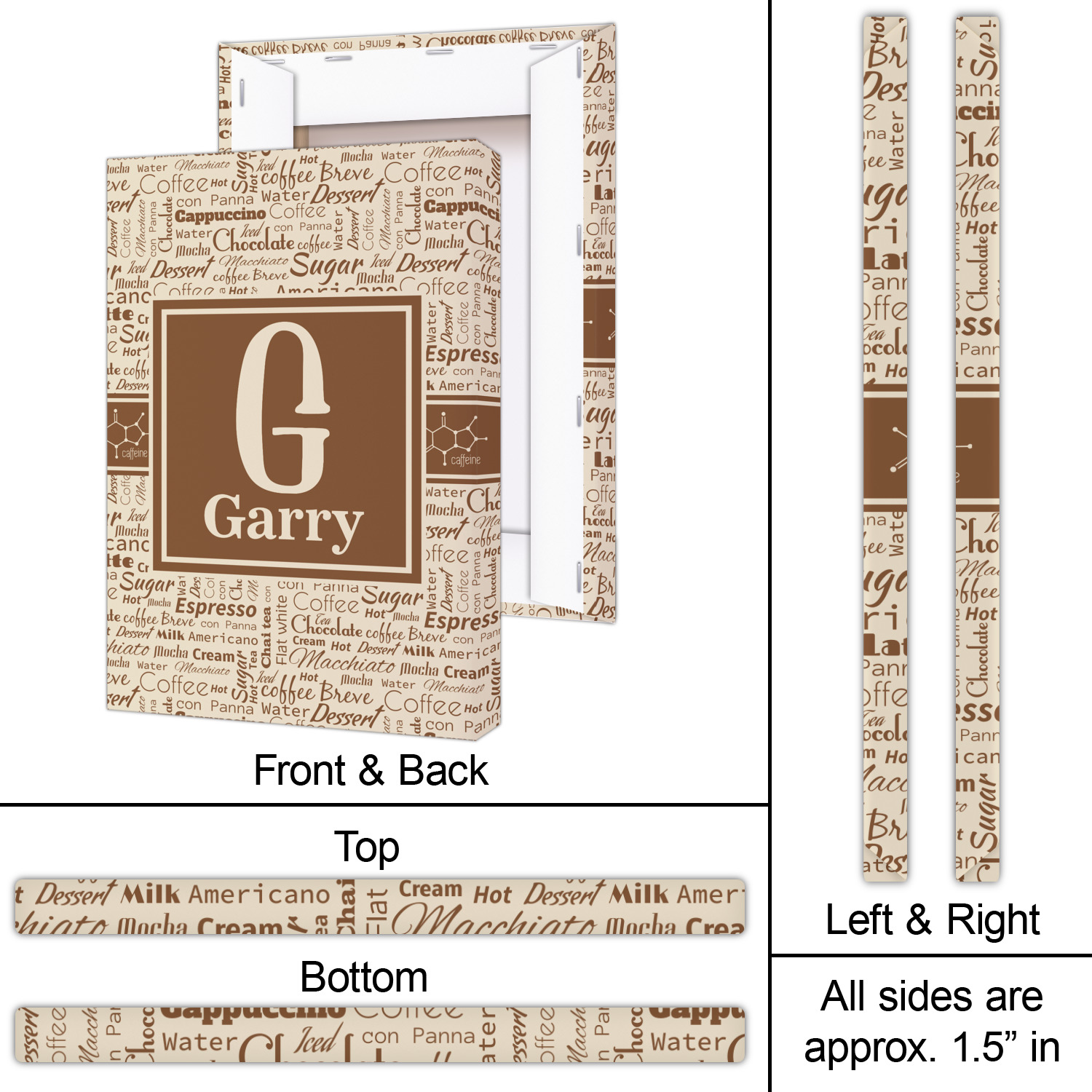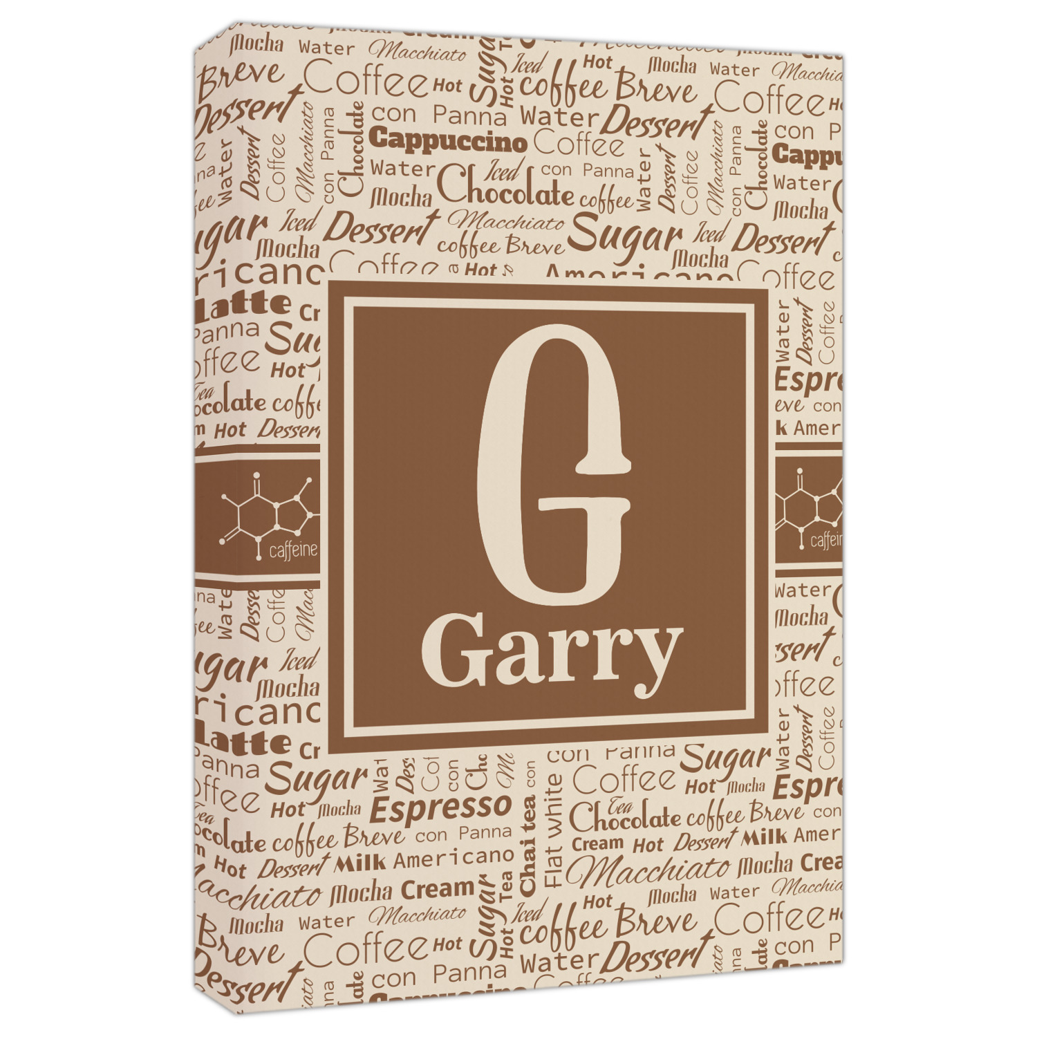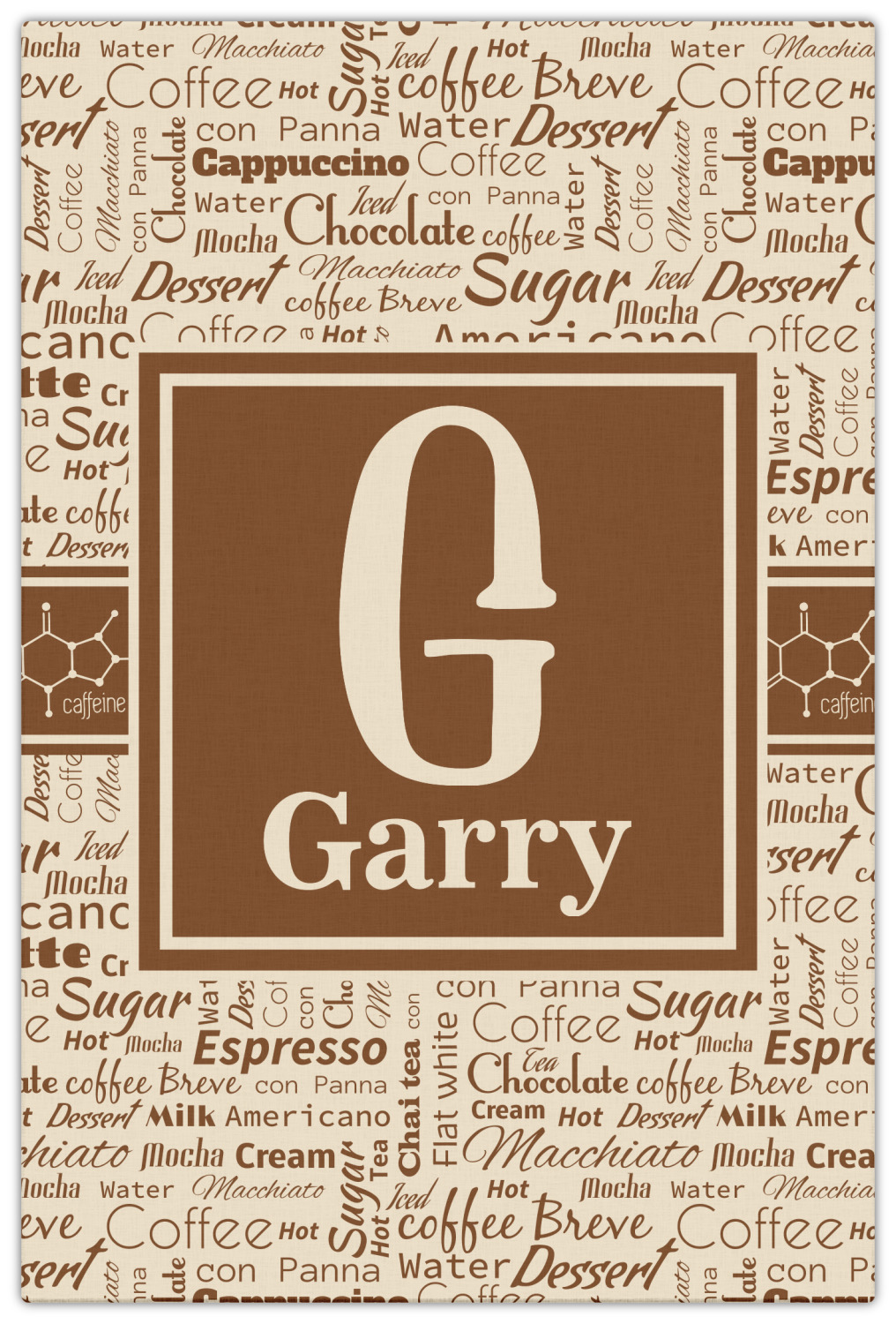 This design has a fun word cloud background with words like macchiato, sugar, coffee, latte, americano, and more. The colors are a light cream and chocolate brown. In the center is a frame where you are able to add personalization. The ribbon behind the frame has the chemical symbol for caffiene.