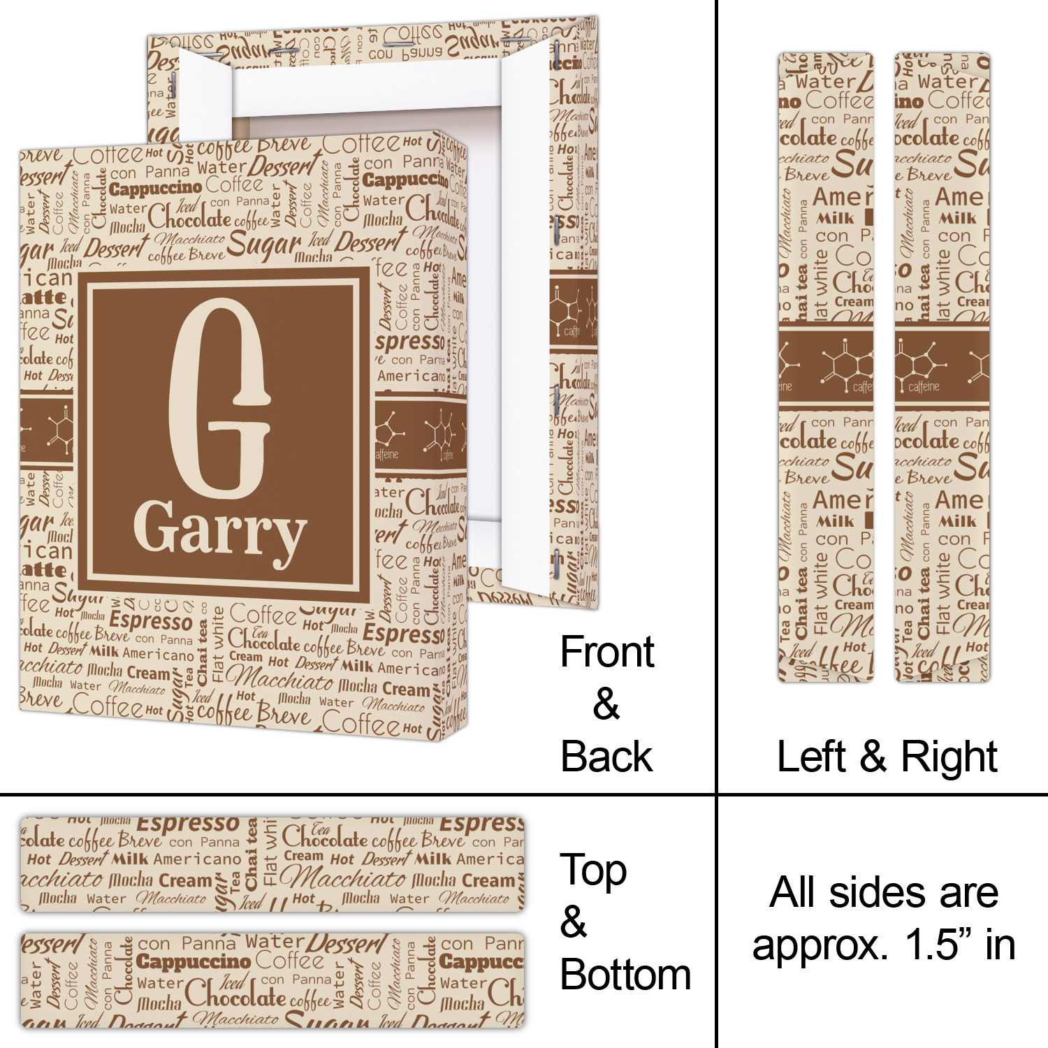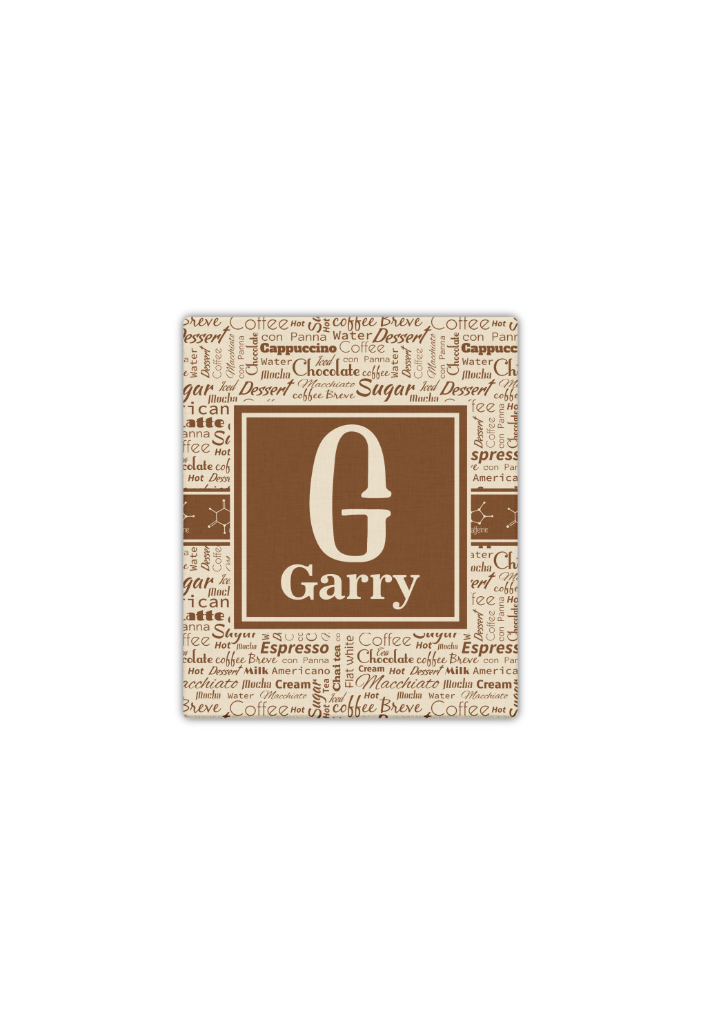This design has a fun word cloud background with words like macchiato, sugar, coffee, latte, americano, and more. The colors are a light cream and chocolate brown. In the center is a frame where you are able to add personalization. The ribbon behind the frame has the chemical symbol for caffiene.