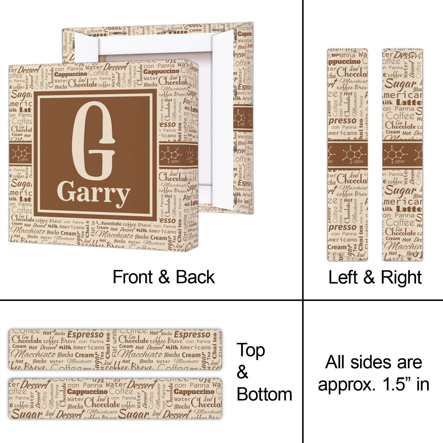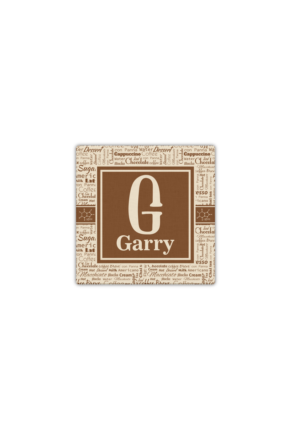 This design has a fun word cloud background with words like macchiato, sugar, coffee, latte, americano, and more. The colors are a light cream and chocolate brown. In the center is a frame where you are able to add personalization. The ribbon behind the frame has the chemical symbol for caffiene.