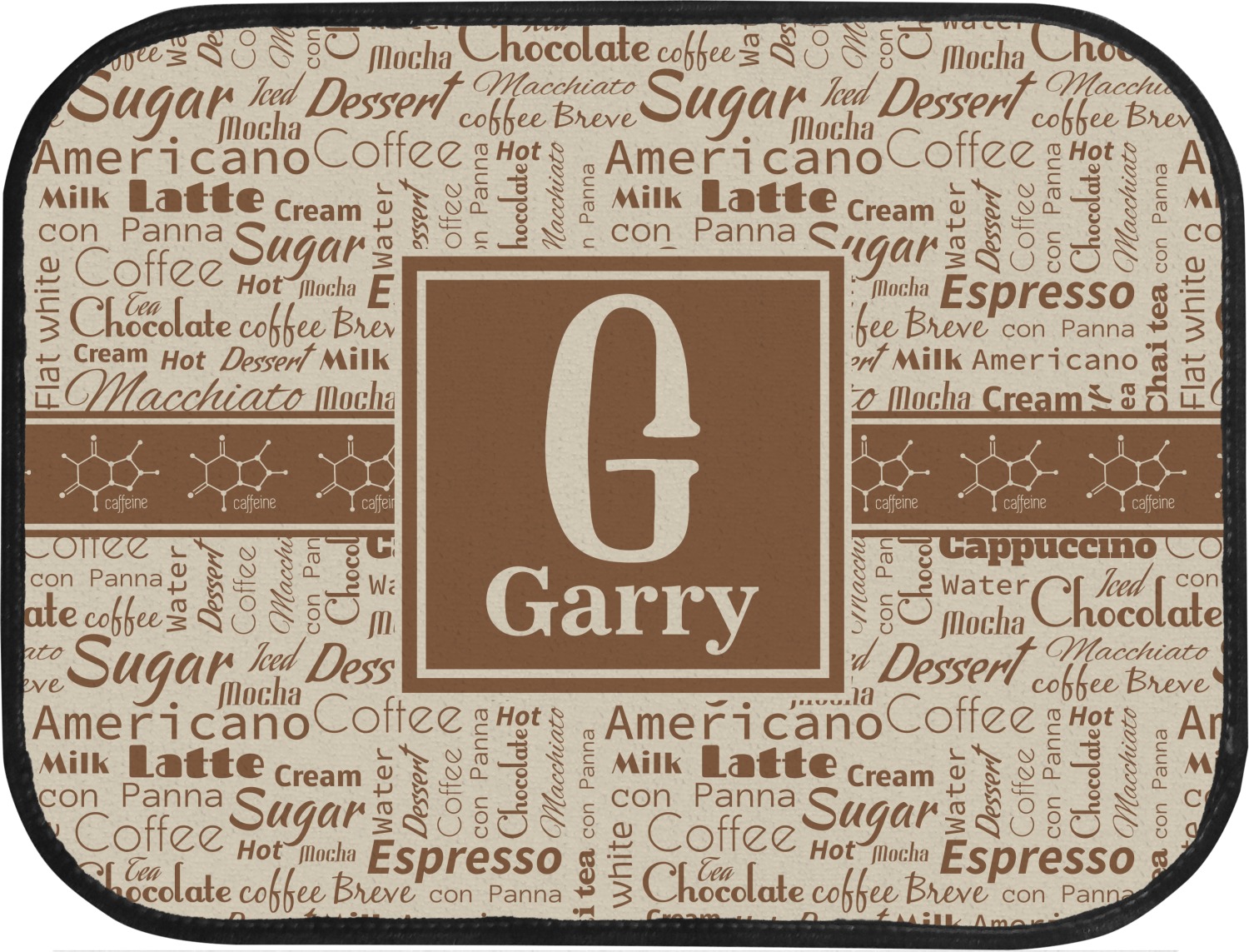 This design has a fun word cloud background with words like macchiato, sugar, coffee, latte, americano, and more. The colors are a light cream and chocolate brown. In the center is a frame where you are able to add personalization. The ribbon behind the frame has the chemical symbol for caffiene.