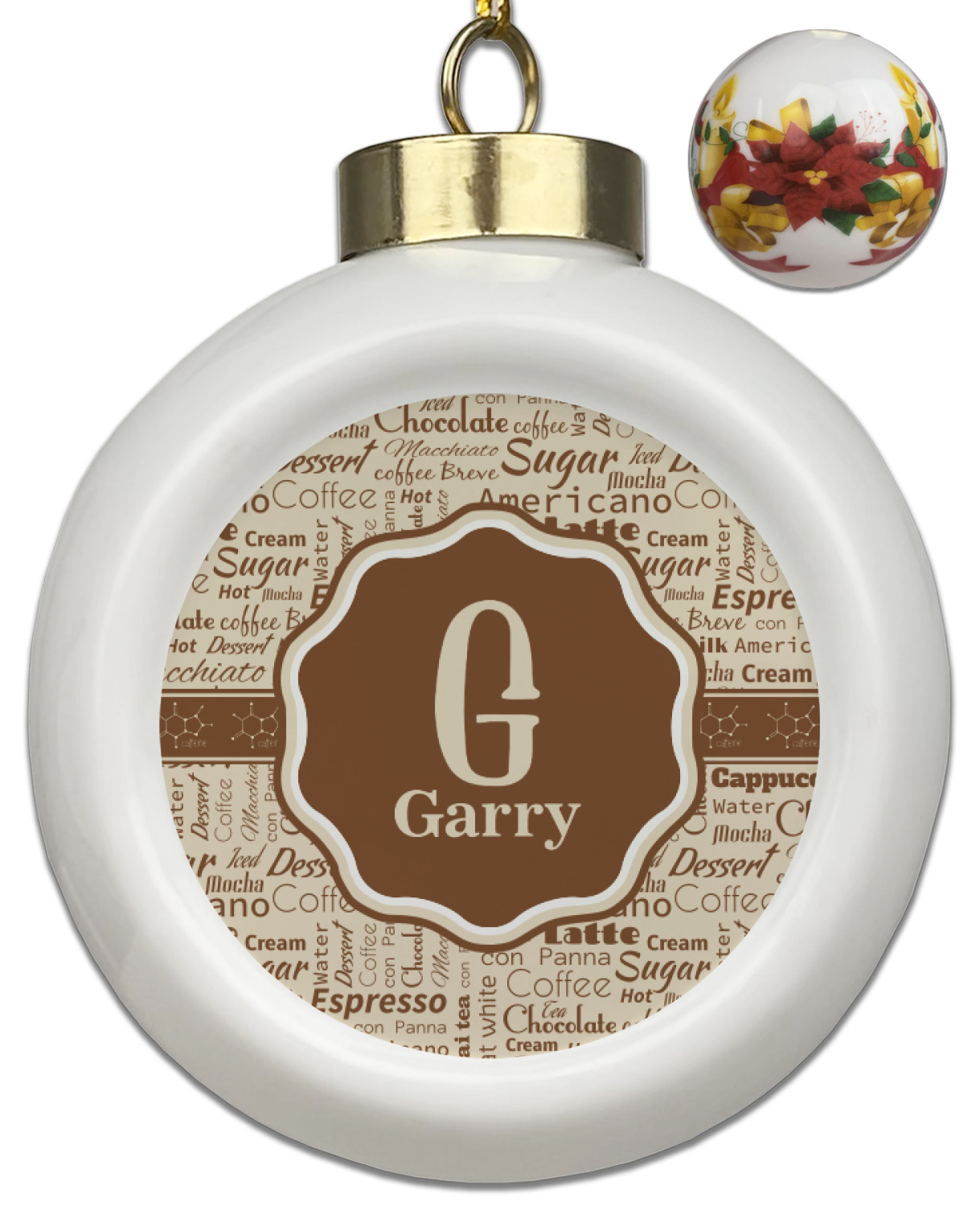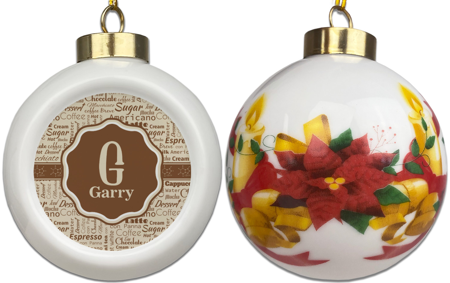 Our Christmas ornaments are a unique ceramic ball shape with a twist as it has a flat face to display your custom design! Select from one of our two design types - Christmas Tree or Poinsettia Garland - to adorn the curved back of your personal design. Each ornament measures 3H x 2.5W x 2D accompanied with a gold string accent for finishing touches to hang on your beautiful Christmas tree!