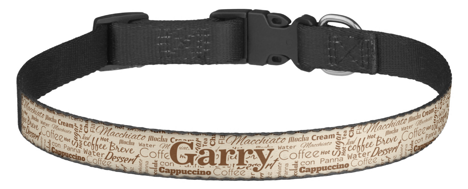This sturdy collar, made from a durable nylon weave, will outlive your dog's episodes of excited tugging and pulling. Courtesy of its thick plastic buckle and adjuster, this collar is adjustable and accommodating of any dog. Structurally, the collar is a single piece of nylon weave that is sewn together, and features a solid metal loop where you can attach a leash or dog tag. We print and display your dog's name and pattern across the middle of the personalized dog collar.