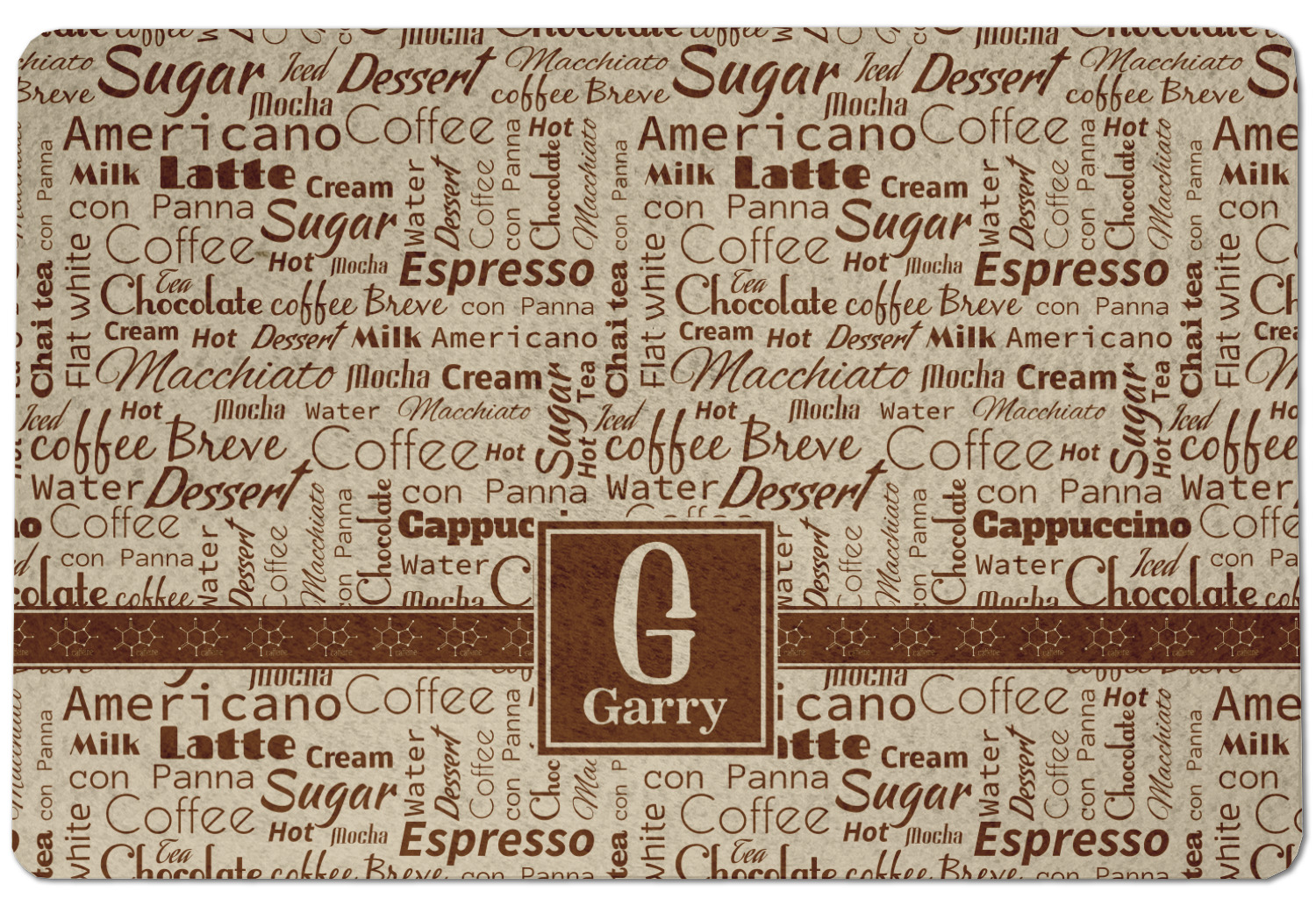 This design has a fun word cloud background with words like macchiato, sugar, coffee, latte, americano, and more. The colors are a light cream and chocolate brown. In the center is a frame where you are able to add personalization. The ribbon behind the frame has the chemical symbol for caffiene.