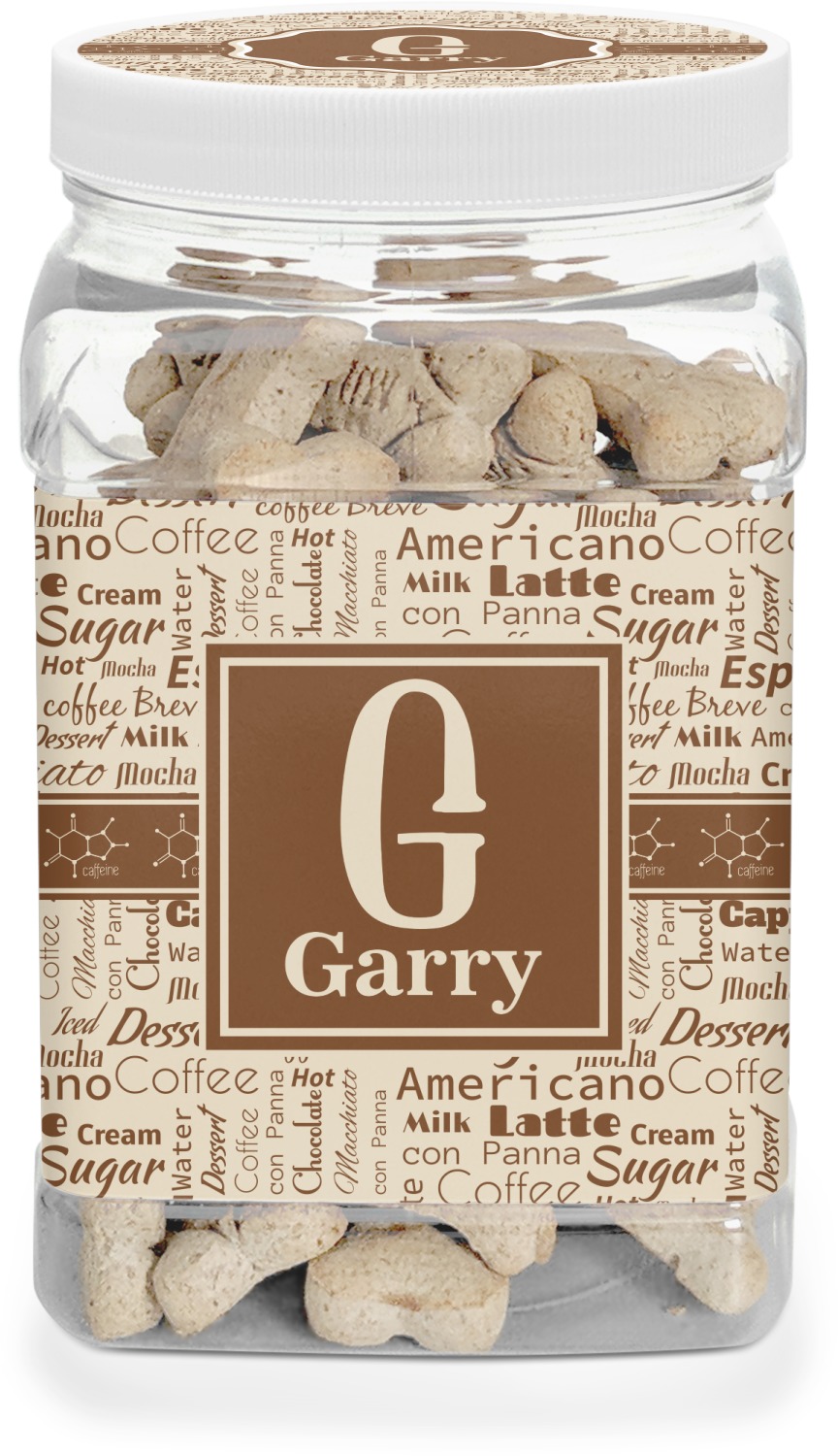 This half gallon jar, made from a sturdy plastic, is the perfect way to keep treats from any naughty pet paws, while still keeping them ready on hand for when your pup performs an impressive trick. This dog cookie jar features a screw-on, white lid that displays your personalized design on a vinyl sticker. We apply another customized sticker that wraps around the front and sides of the jar. Our dog treat jar also has indentations on the rear ends of the sides, which allows for convenient handling, and its square frame allows for easy storage.