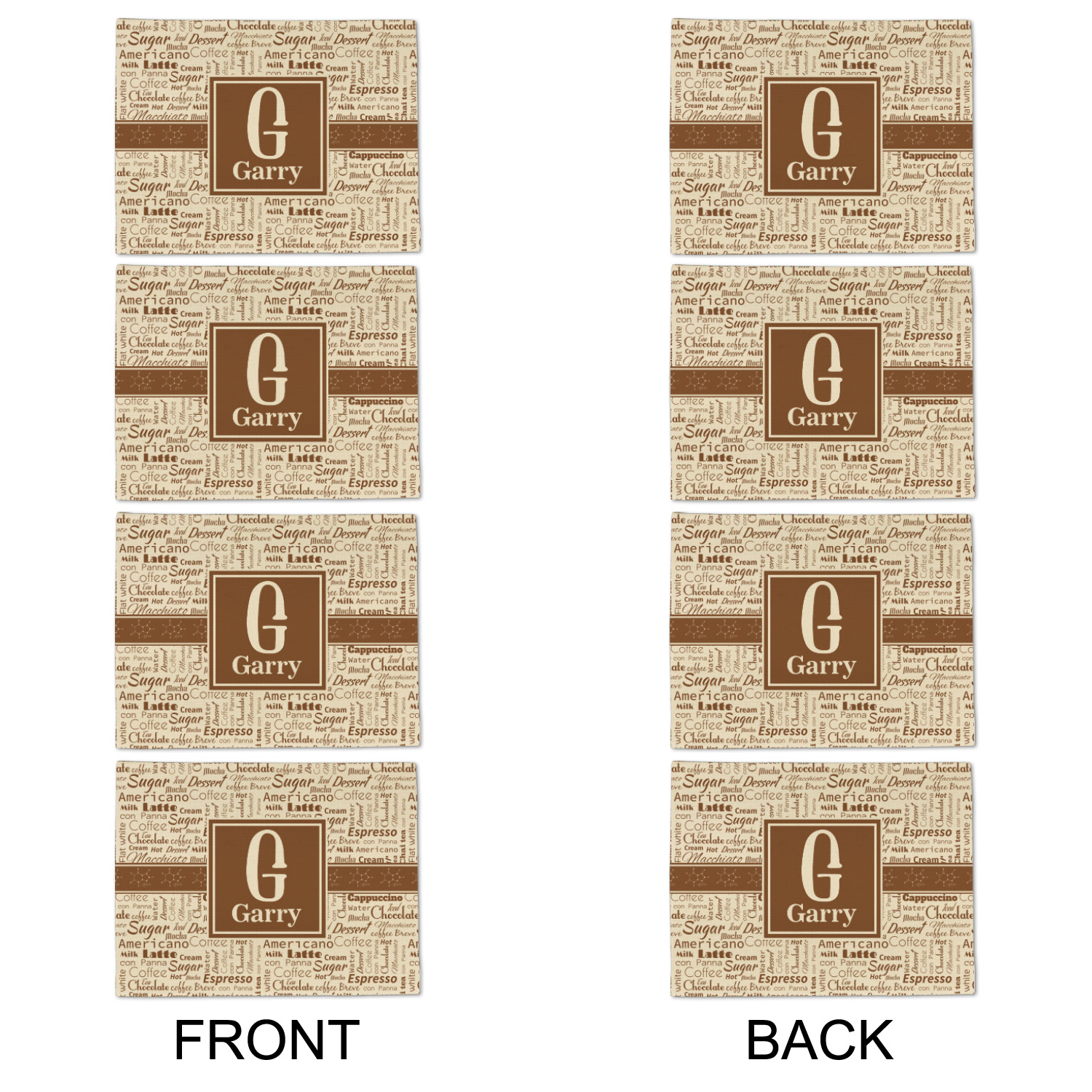This design has a fun word cloud background with words like macchiato, sugar, coffee, latte, americano, and more. The colors are a light cream and chocolate brown. In the center is a frame where you are able to add personalization. The ribbon behind the frame has the chemical symbol for caffiene.