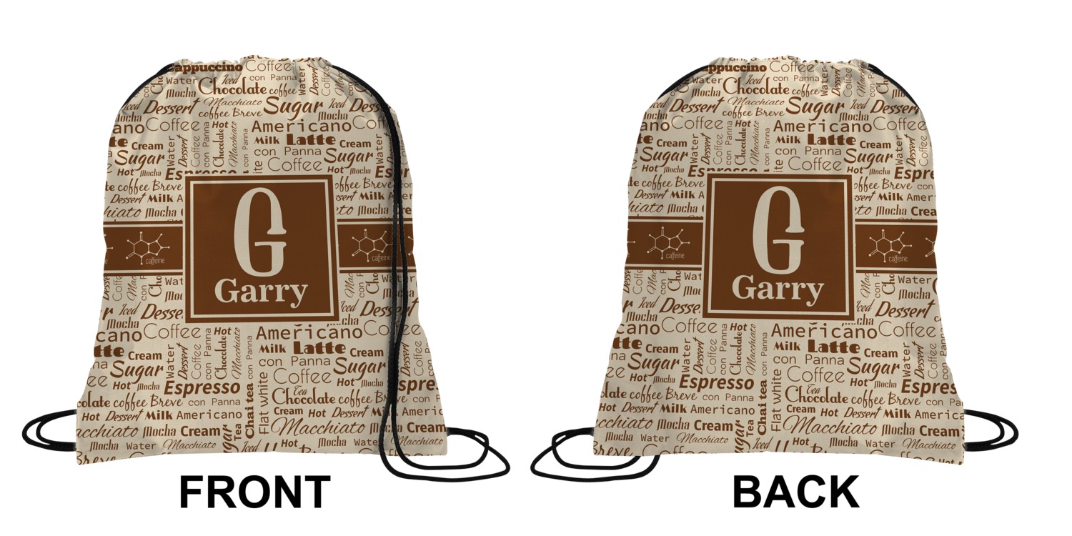Your custom design will appear on the front and the back of the backpack. You can customize each side individually. The inside of the backpack is white and the drawstrings are black. The back pack is made of 100% polyester fabric.