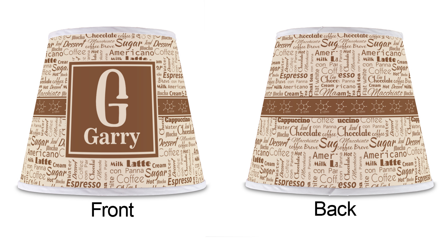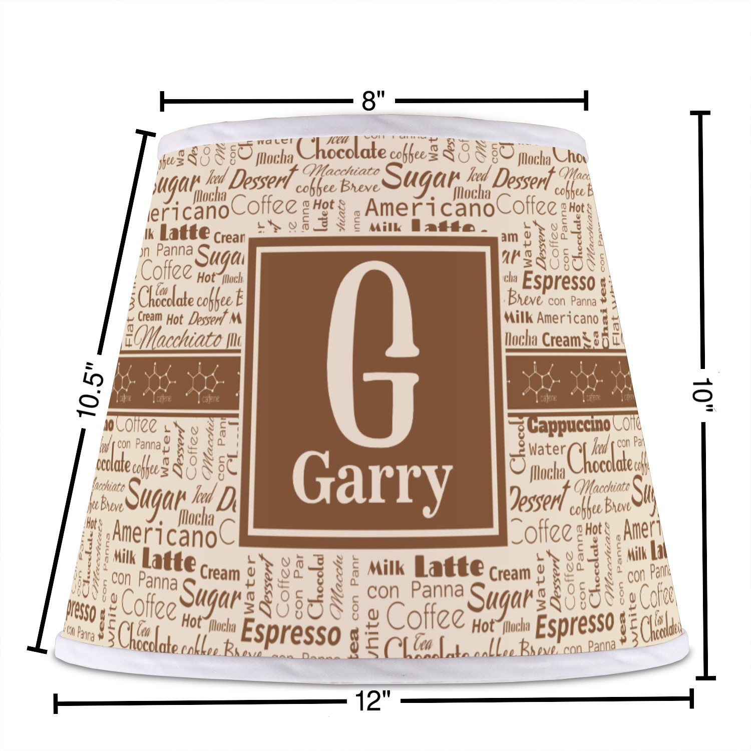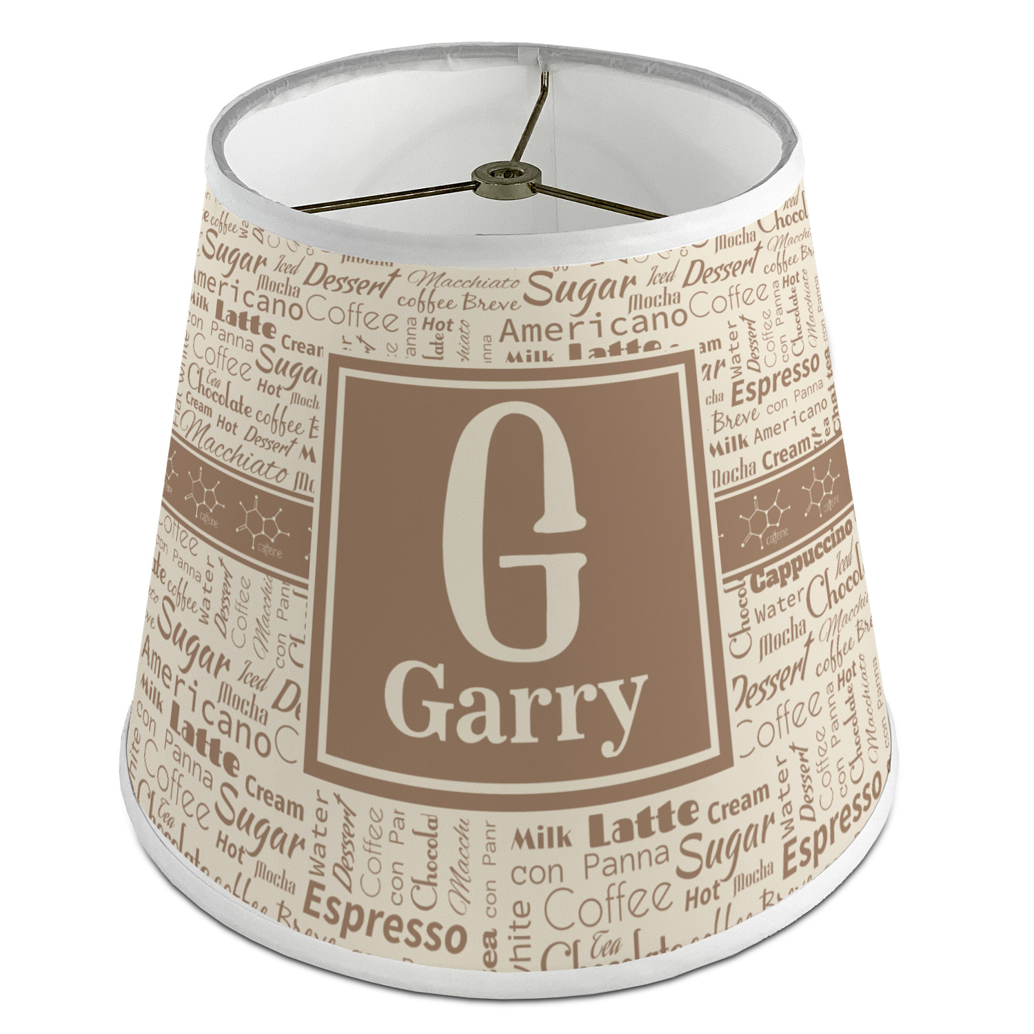 This design has a fun word cloud background with words like macchiato, sugar, coffee, latte, americano, and more. The colors are a light cream and chocolate brown. In the center is a frame where you are able to add personalization. The ribbon behind the frame has the chemical symbol for caffiene.