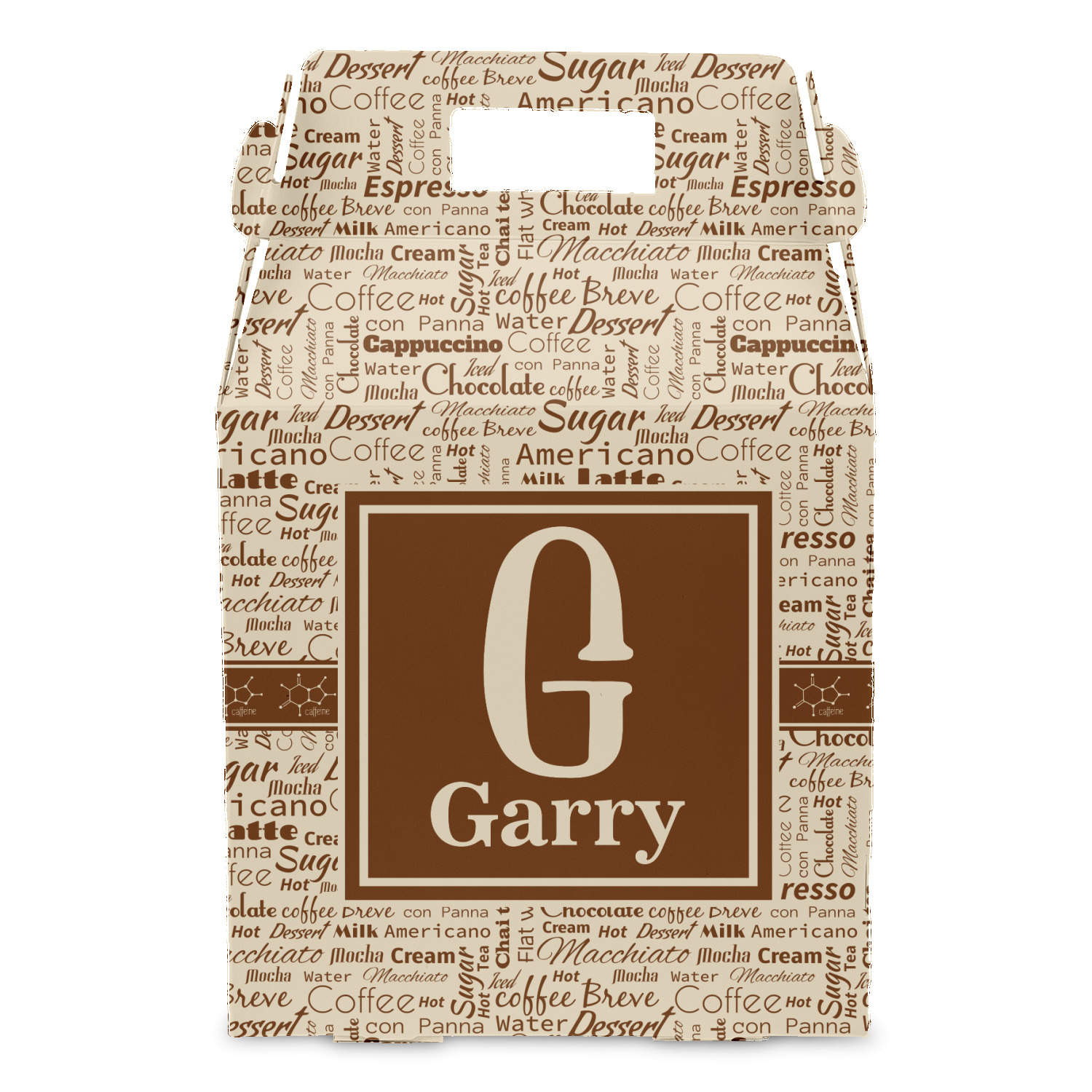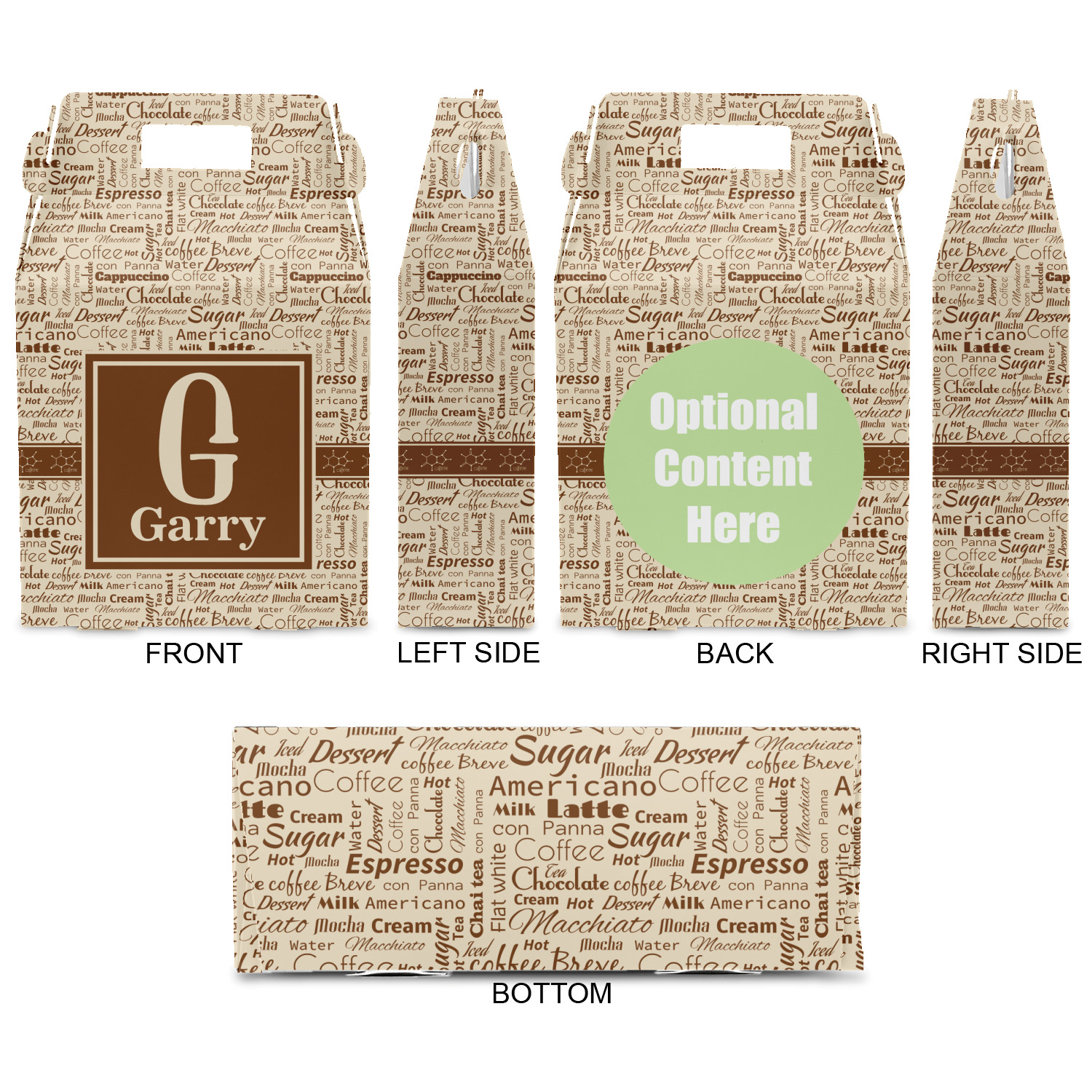 This design has a fun word cloud background with words like macchiato, sugar, coffee, latte, americano, and more. The colors are a light cream and chocolate brown. In the center is a frame where you are able to add personalization. The ribbon behind the frame has the chemical symbol for caffiene.