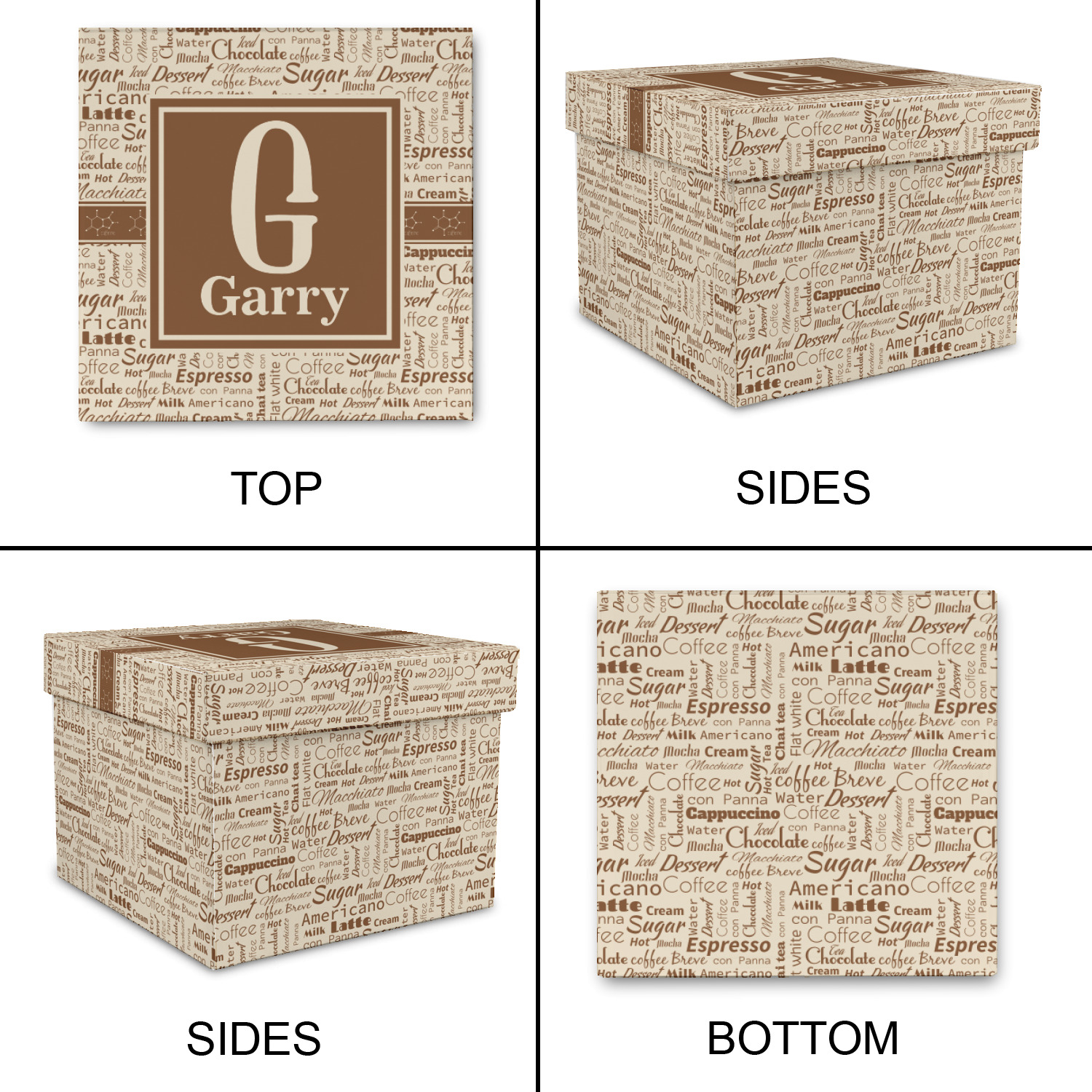 This design has a fun word cloud background with words like macchiato, sugar, coffee, latte, americano, and more. The colors are a light cream and chocolate brown. In the center is a frame where you are able to add personalization. The ribbon behind the frame has the chemical symbol for caffiene.