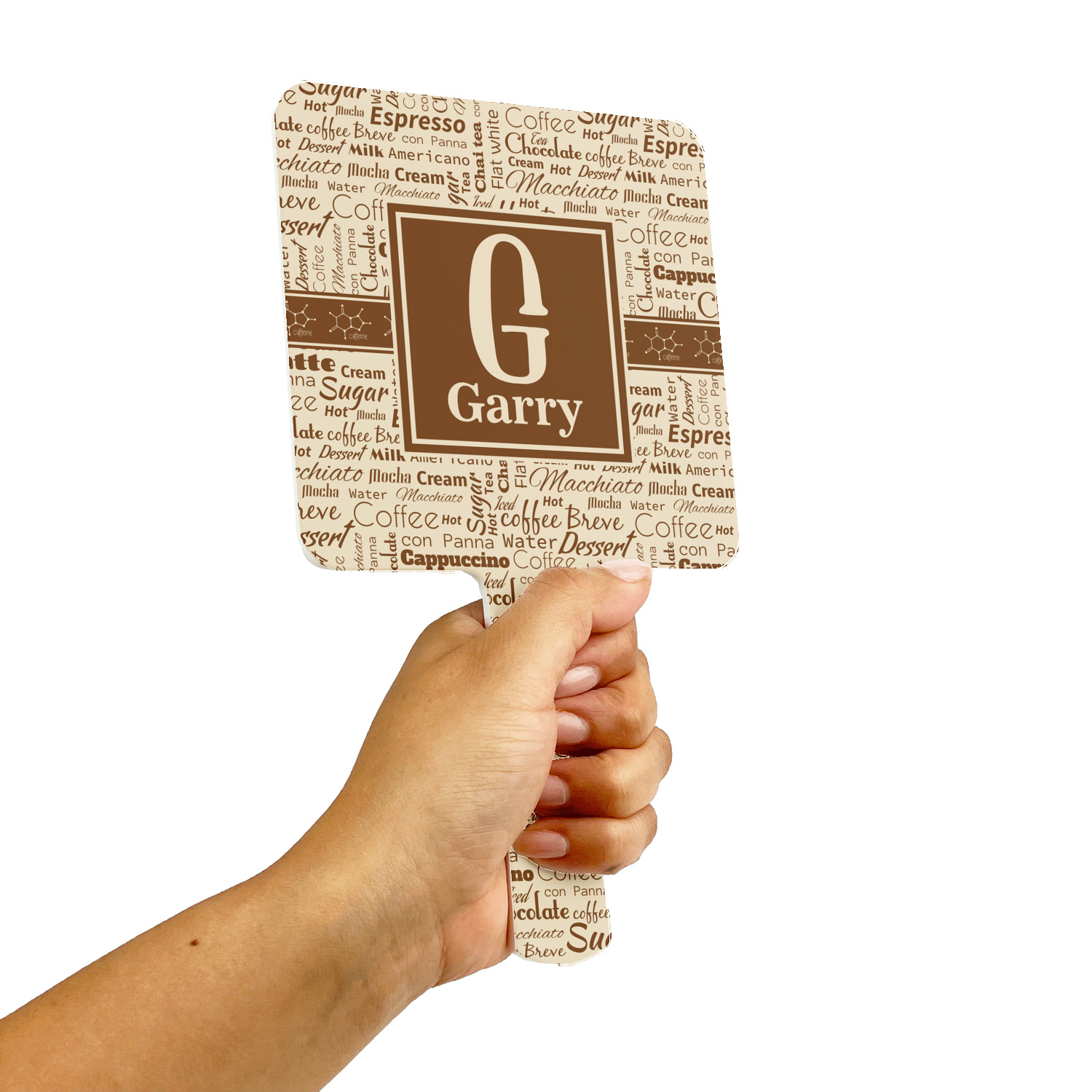 This design has a fun word cloud background with words like macchiato, sugar, coffee, latte, americano, and more. The colors are a light cream and chocolate brown. In the center is a frame where you are able to add personalization. The ribbon behind the frame has the chemical symbol for caffiene.