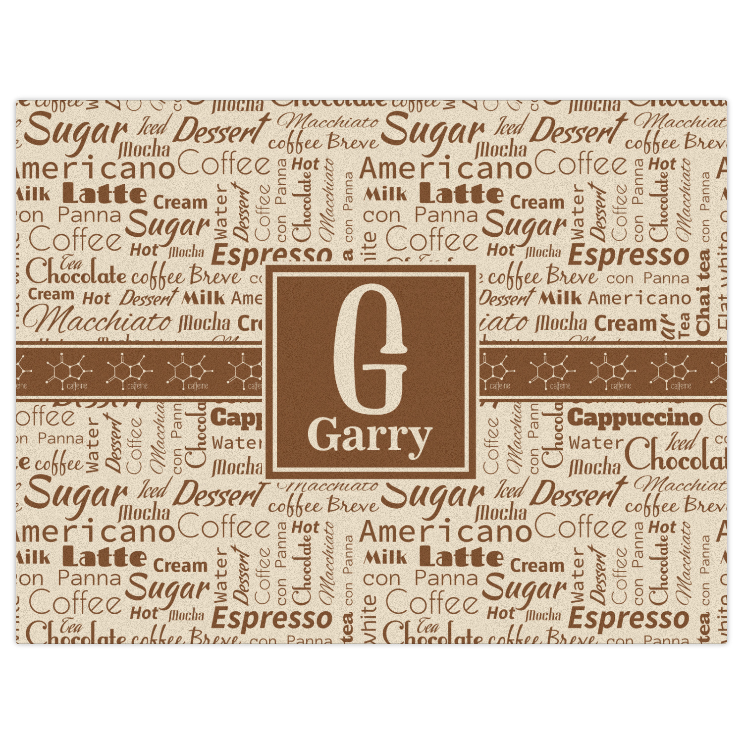 This design has a fun word cloud background with words like macchiato, sugar, coffee, latte, americano, and more. The colors are a light cream and chocolate brown. In the center is a frame where you are able to add personalization. The ribbon behind the frame has the chemical symbol for caffiene.