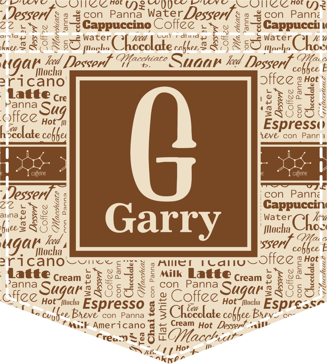 This design has a fun word cloud background with words like macchiato, sugar, coffee, latte, americano, and more. The colors are a light cream and chocolate brown. In the center is a frame where you are able to add personalization. The ribbon behind the frame has the chemical symbol for caffiene.