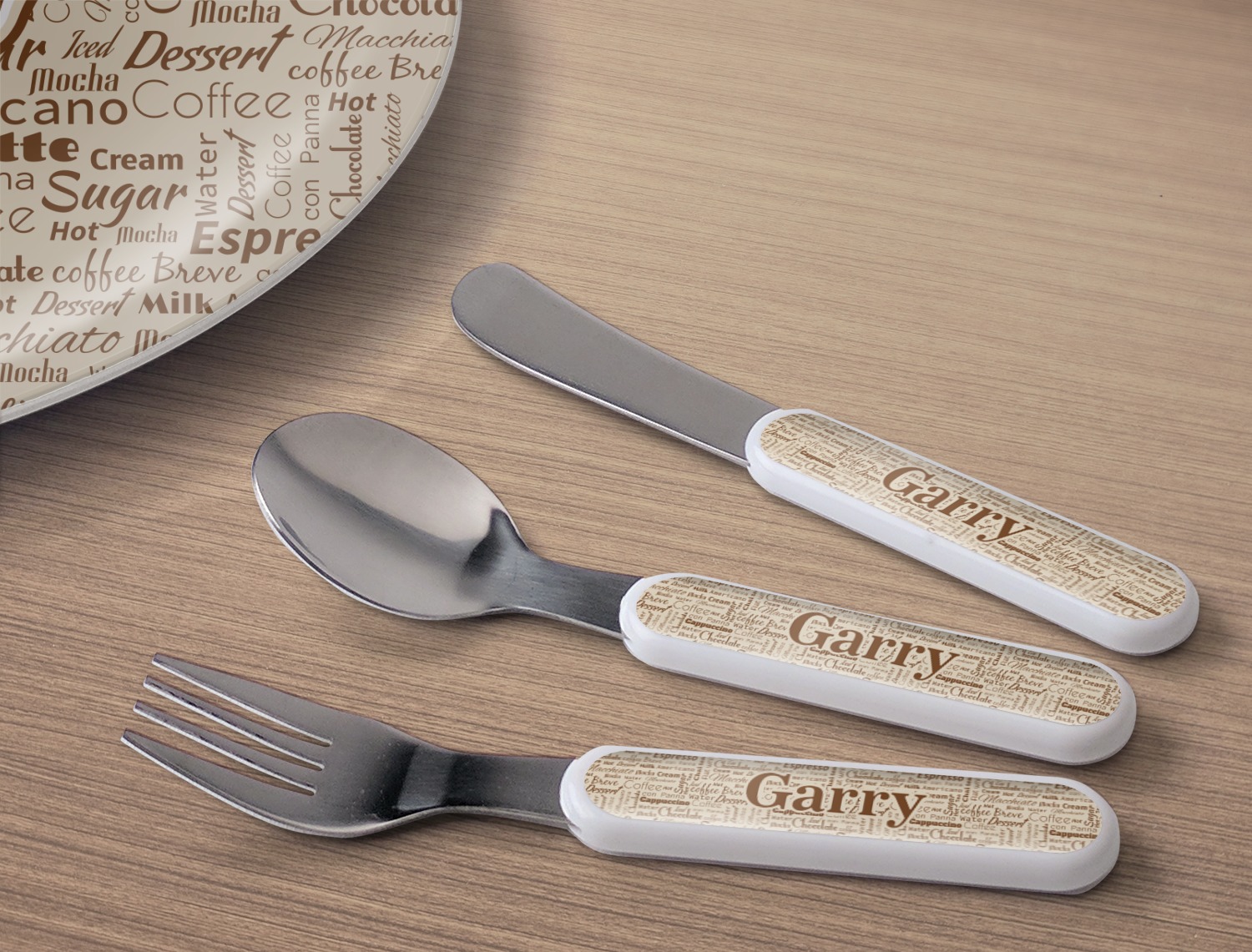 This set of kids' silverware includes a 5.5 inch spoon, fork, and knife, catered to your little one's needs. The prongs of this fork are flat and dull, while our spoon is small enough for tiny mouths, and the dullness of the knife itself resembles a butter knife, at most. These kids' utensils are made of stainless steel, while the handles are crafted from a durable plastic that will withstand the energy and use of your young one. We print your customization across the handles, making the cutlery set unique to your child only.