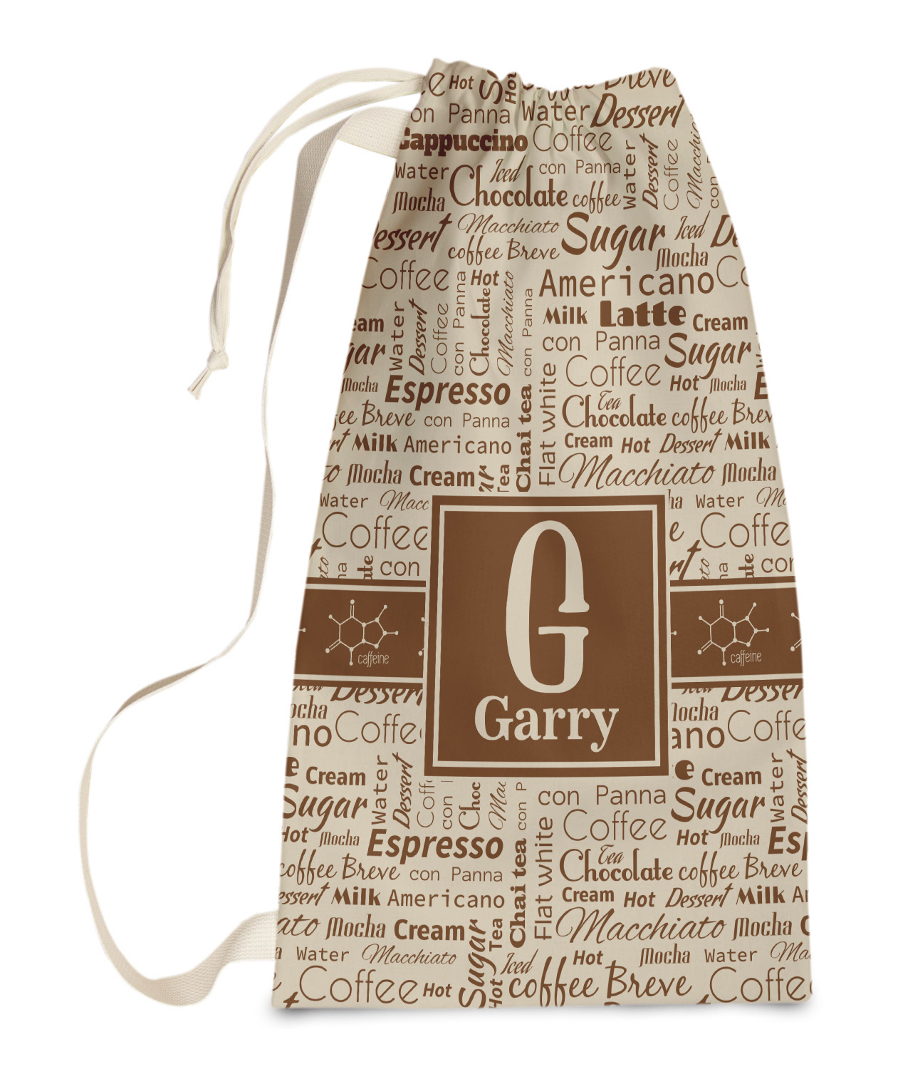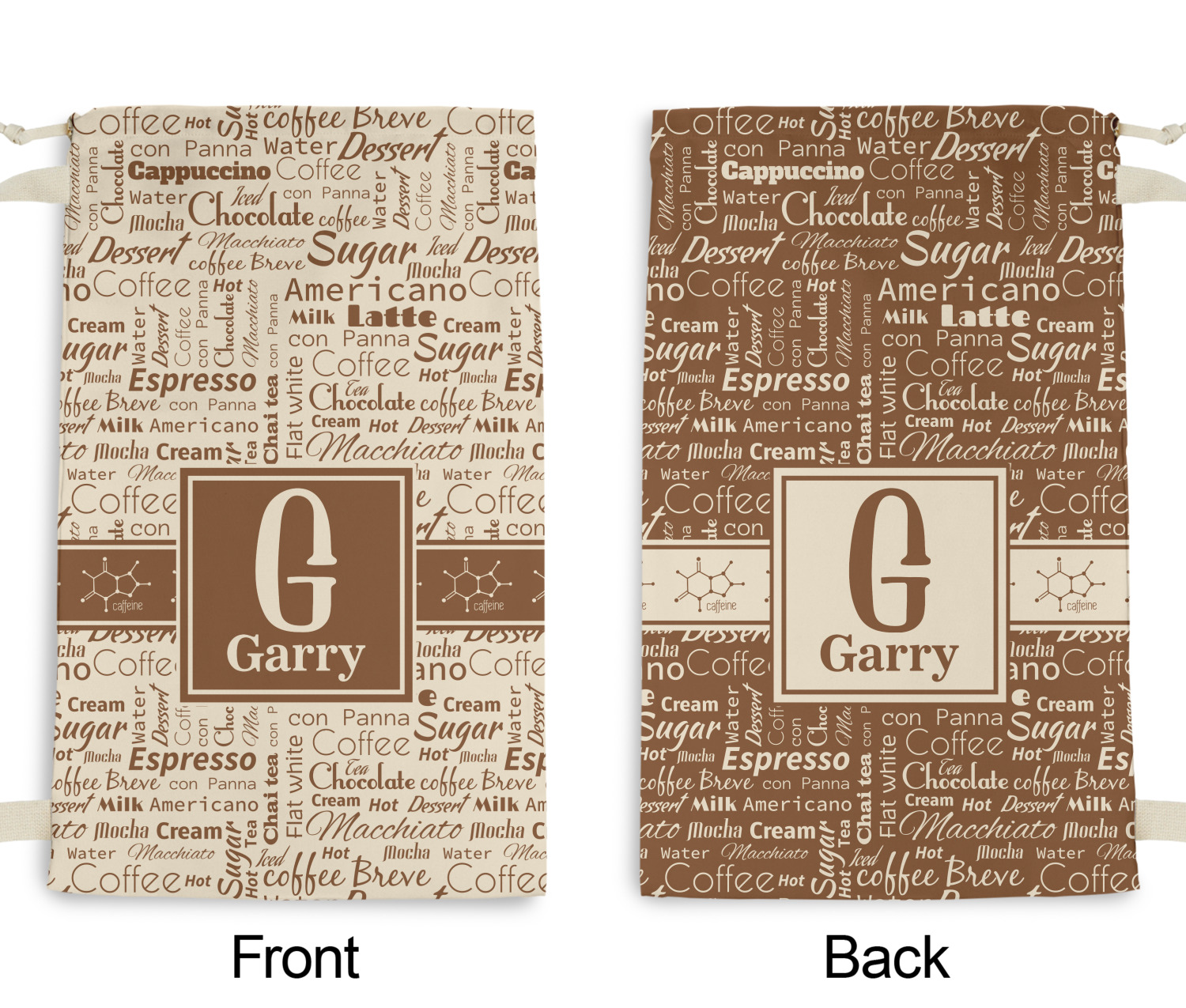 This design has a fun word cloud background with words like macchiato, sugar, coffee, latte, americano, and more. The colors are a light cream and chocolate brown. In the center is a frame where you are able to add personalization. The ribbon behind the frame has the chemical symbol for caffiene.