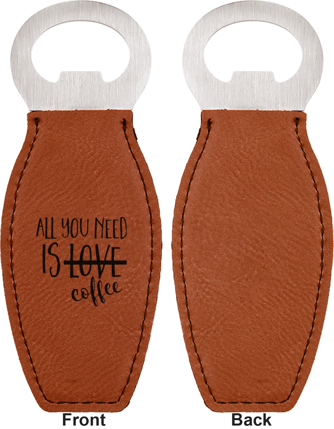 Built from stainless steel, these custom bottle openers are wrapped in a cognac-colored leatherette. Sharp, black stitching lines the edges for extra durability and a finished touch. Your personalization is laser-engraved onto the surface of this leatherette, leaving behind a crisp, black coloration. At 4.6 by 1.8 inches, this beer bottle opener gives you much of leverage when trying to open a stubborn bottle. On the opposite end of the opener, you'll find a magnet that you can use to display your new, unique bottle opener!