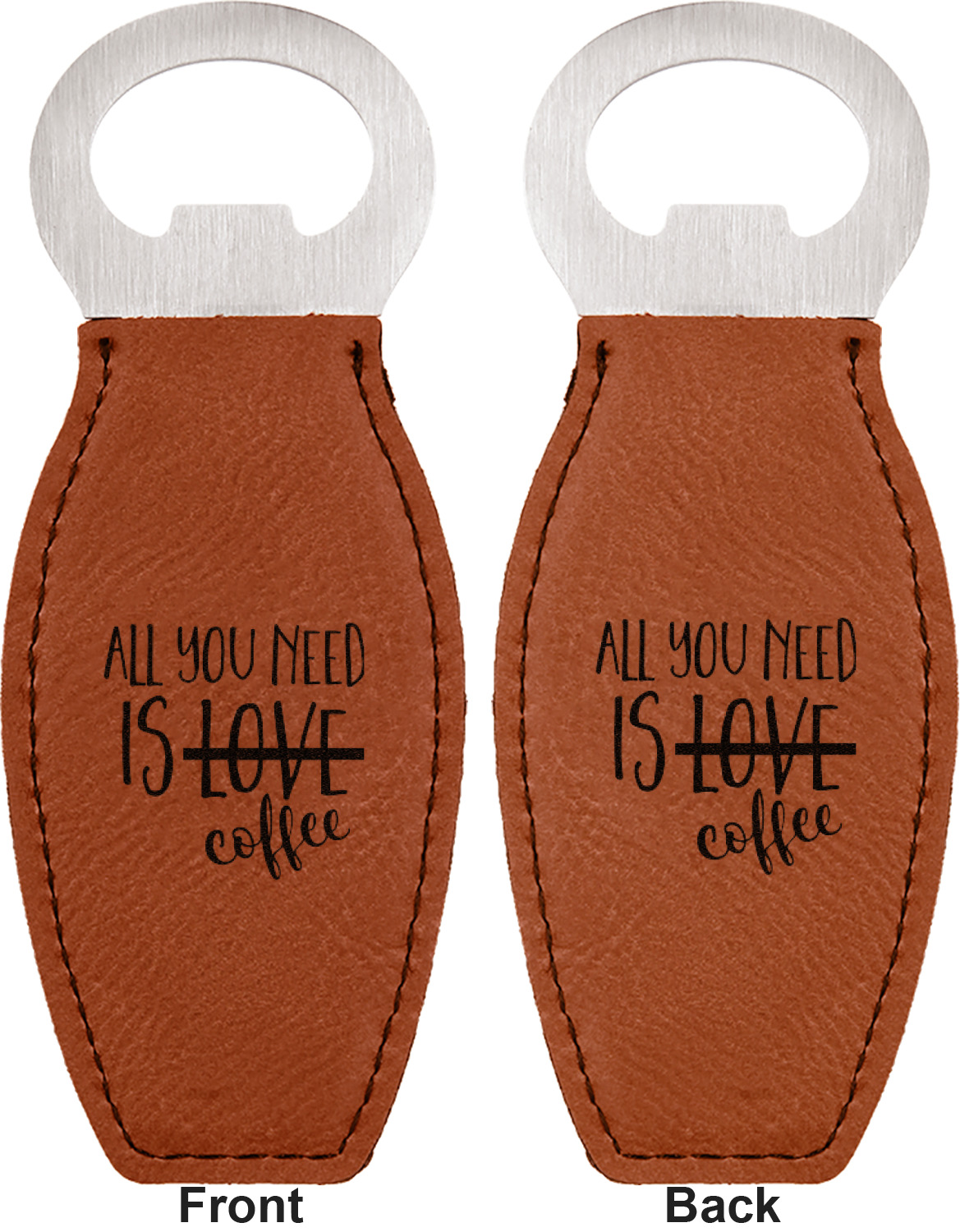 Built from stainless steel, these custom bottle openers are wrapped in a cognac-colored leatherette. Sharp, black stitching lines the edges for extra durability and a finished touch. Your personalization is laser-engraved onto the surface of this leatherette, leaving behind a crisp, black coloration. At 4.6 by 1.8 inches, this beer bottle opener gives you much of leverage when trying to open a stubborn bottle. On the opposite end of the opener, you'll find a magnet that you can use to display your new, unique bottle opener!