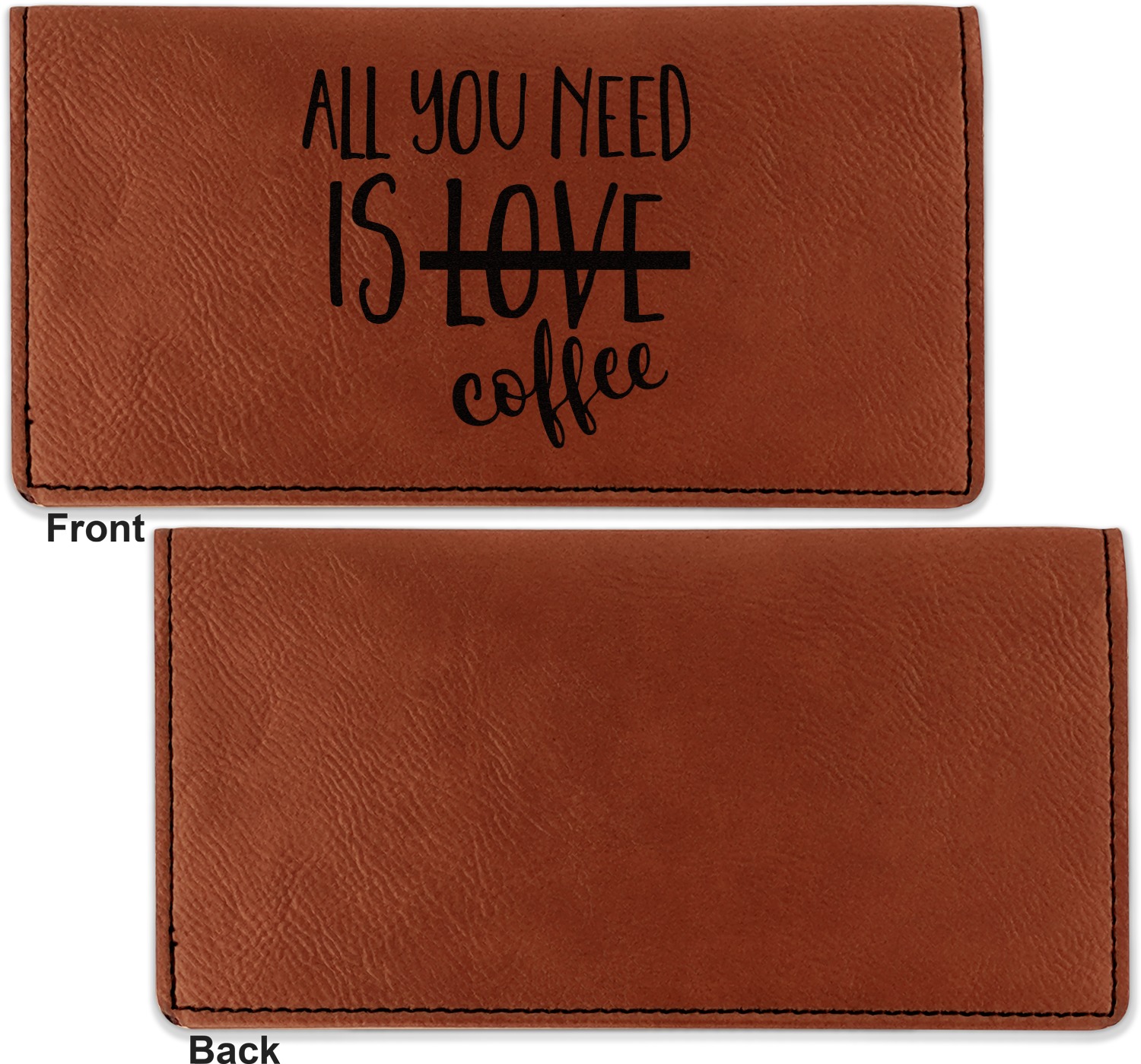 Go into our design center to start personalizing. Your checkbook cover will be laser engraved, making the graphic or text a black color. Choose a fun saying, monogram, or font to go on your checkbook cover. You have the opportunity to do it double or single sided.