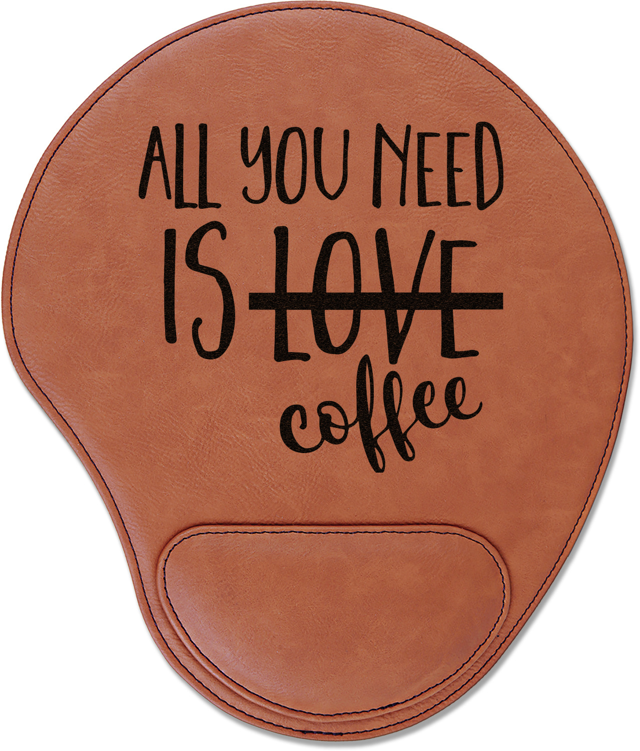 In a rounded shape, this mouse pad is made of a luxurious, cognac-colored leatherette. The nature of this material allows your mouse to glide smoothly across its surface. Strong stitching lines the edges to guarantee stability and strength. As added support for tired wrists, your personalized mouse pad features a supportive wrist rest at its bottom. This model measures at 10.25" x 9", while its wrist pad is approximately 5" x 2.75", with a thickness of 0.75". Your personalized design is laser engraved into the front face of this mouse pad.
