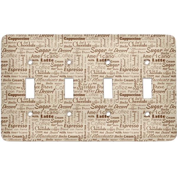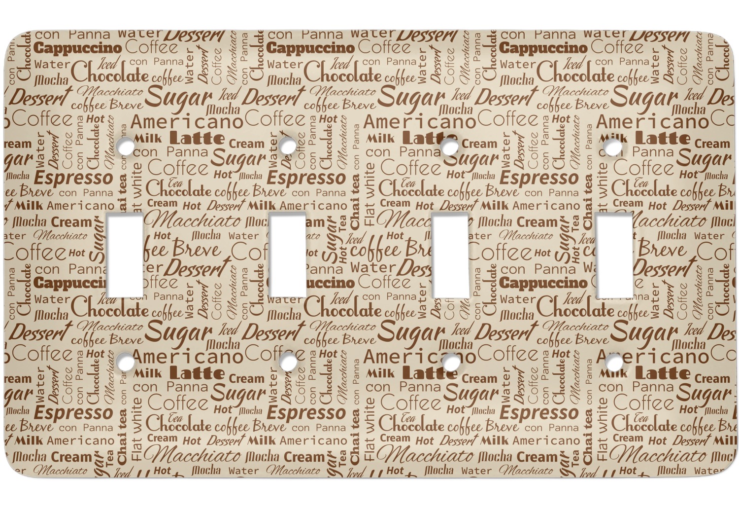 This design has a fun word cloud background with words like macchiato, sugar, coffee, latte, americano, and more. The colors are a light cream and chocolate brown. In the center is a frame where you are able to add personalization. The ribbon behind the frame has the chemical symbol for caffiene.