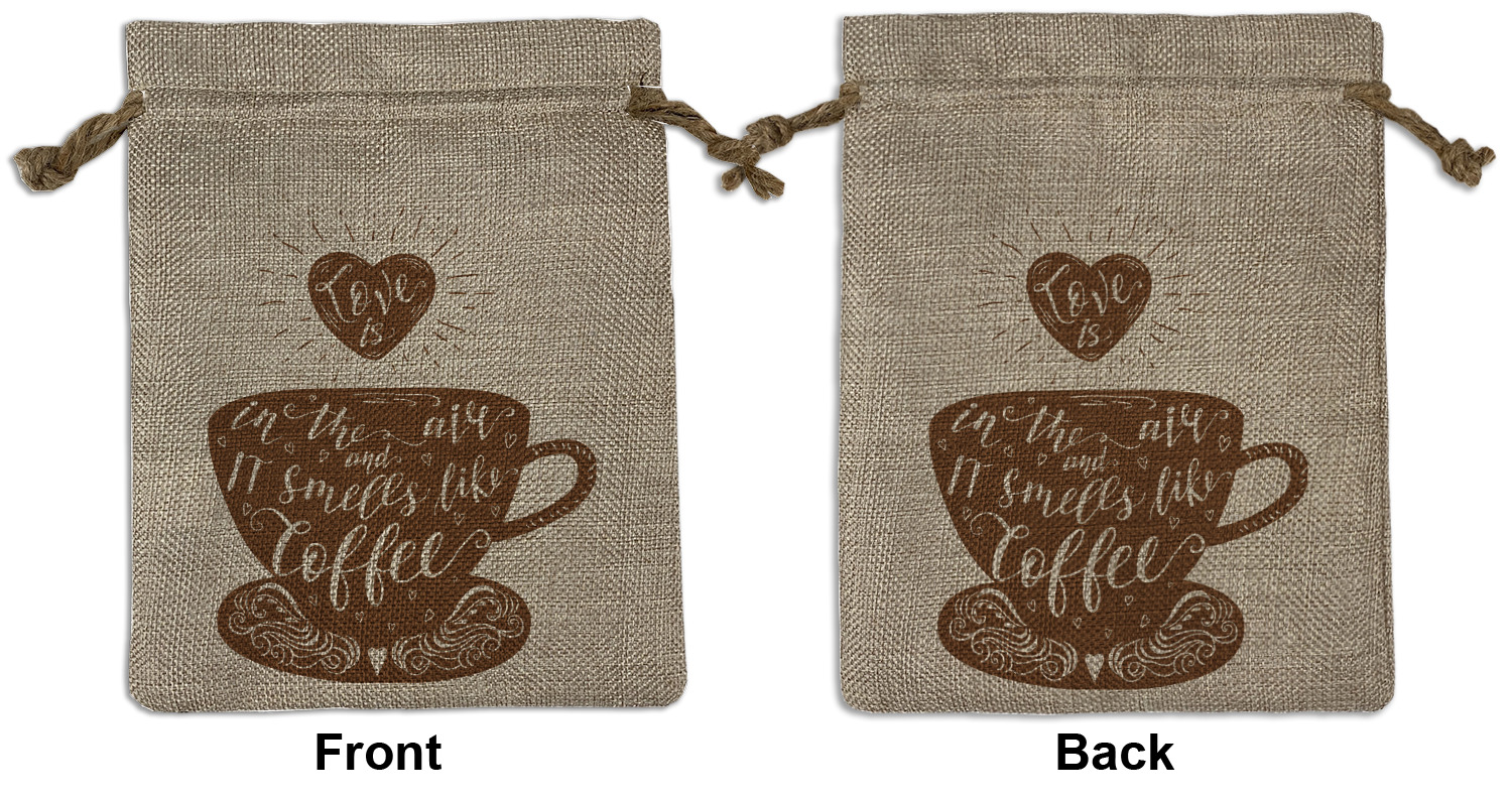 We sell our Burlap Gift Bags in 3 variant sized bags. Made with burlap polyester, each personalized bag can be secured with a twine drawstring pull. Your custom design is available to print on one side or both sides - completely up to you! The sizes of the bags measure approximately 4.5" x 6.5" for the smallest size, 6.5" x 8.0" for the medium size, and 6.5" x 13.5" for the large-sized bag.