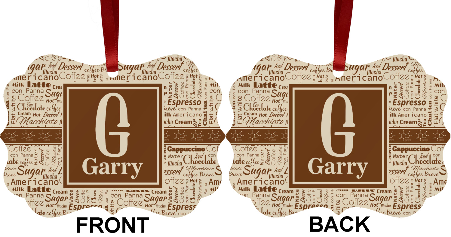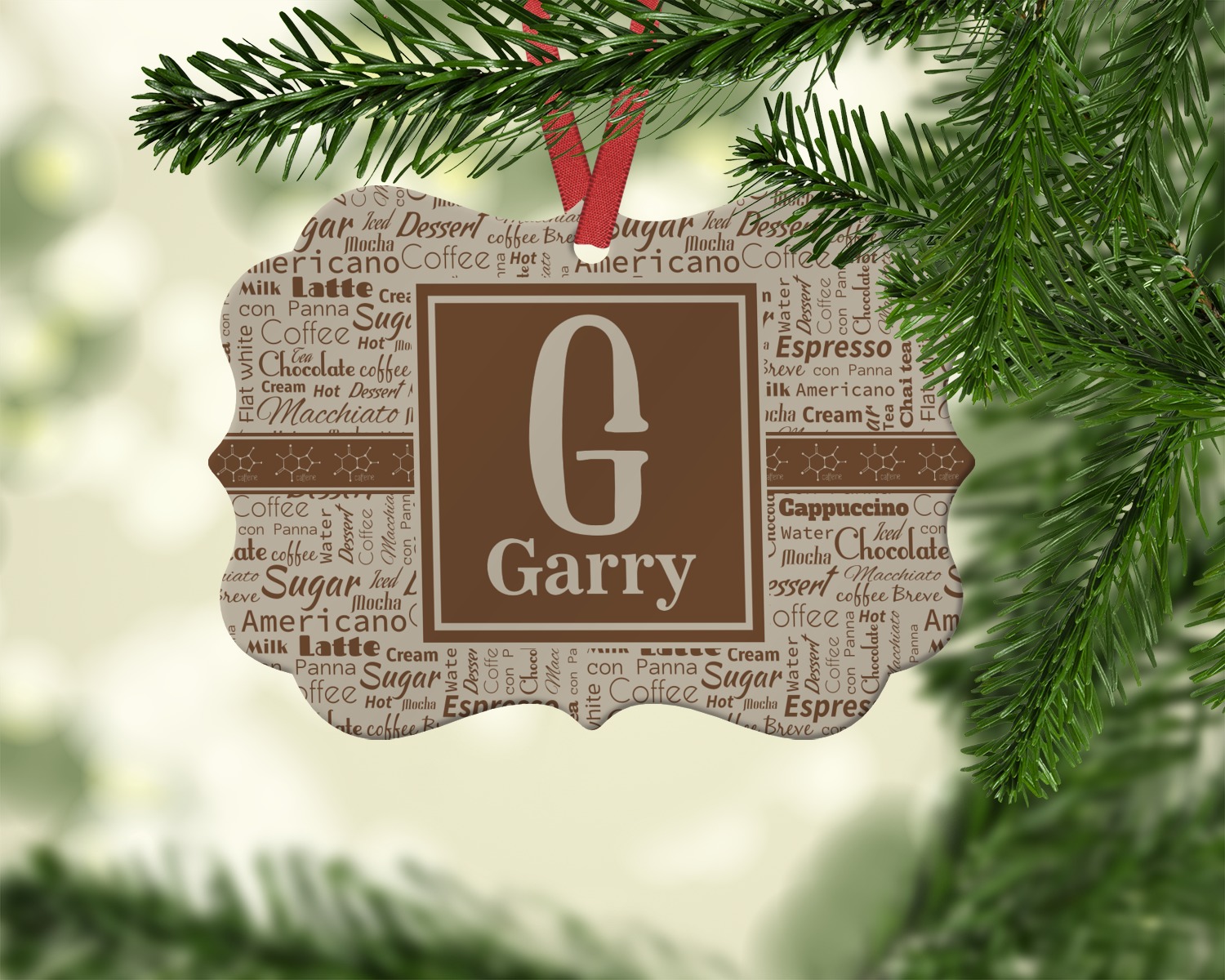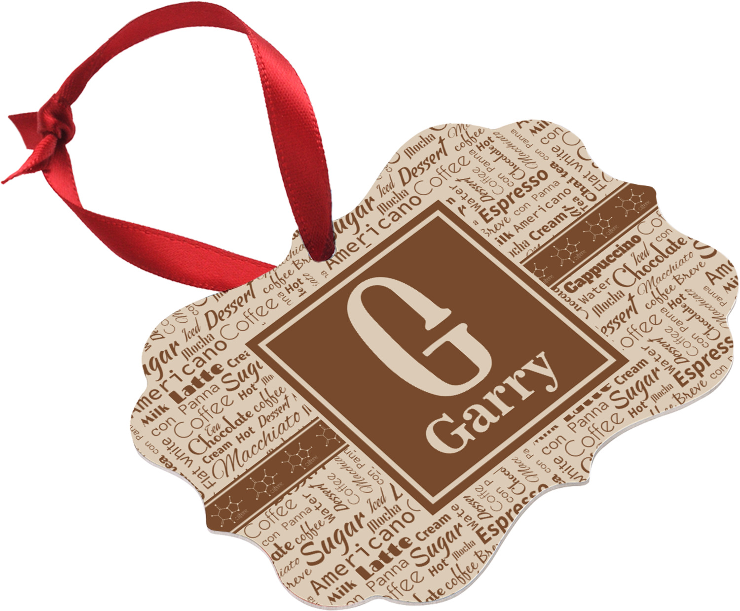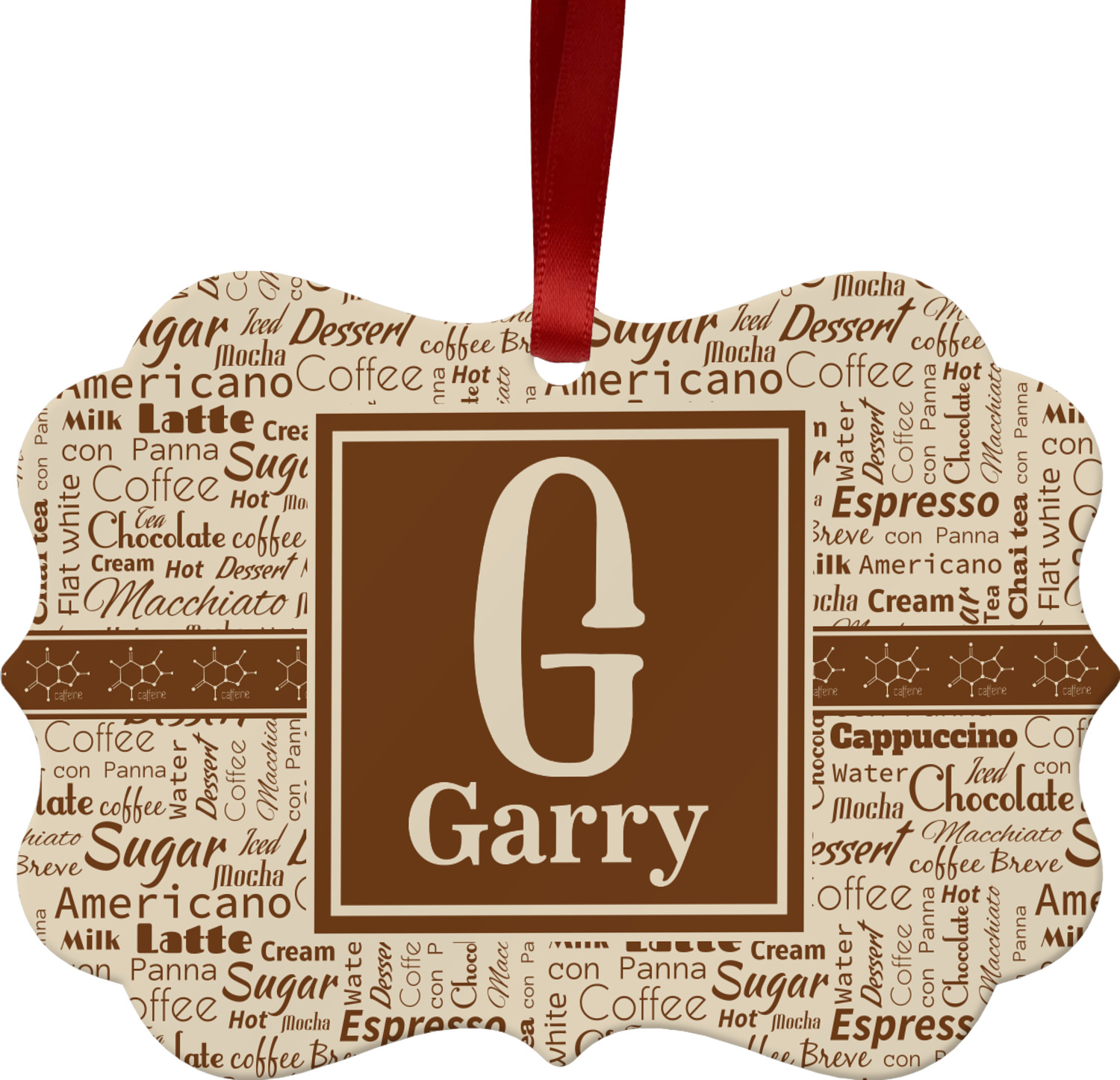 This design has a fun word cloud background with words like macchiato, sugar, coffee, latte, americano, and more. The colors are a light cream and chocolate brown. In the center is a frame where you are able to add personalization. The ribbon behind the frame has the chemical symbol for caffiene.
