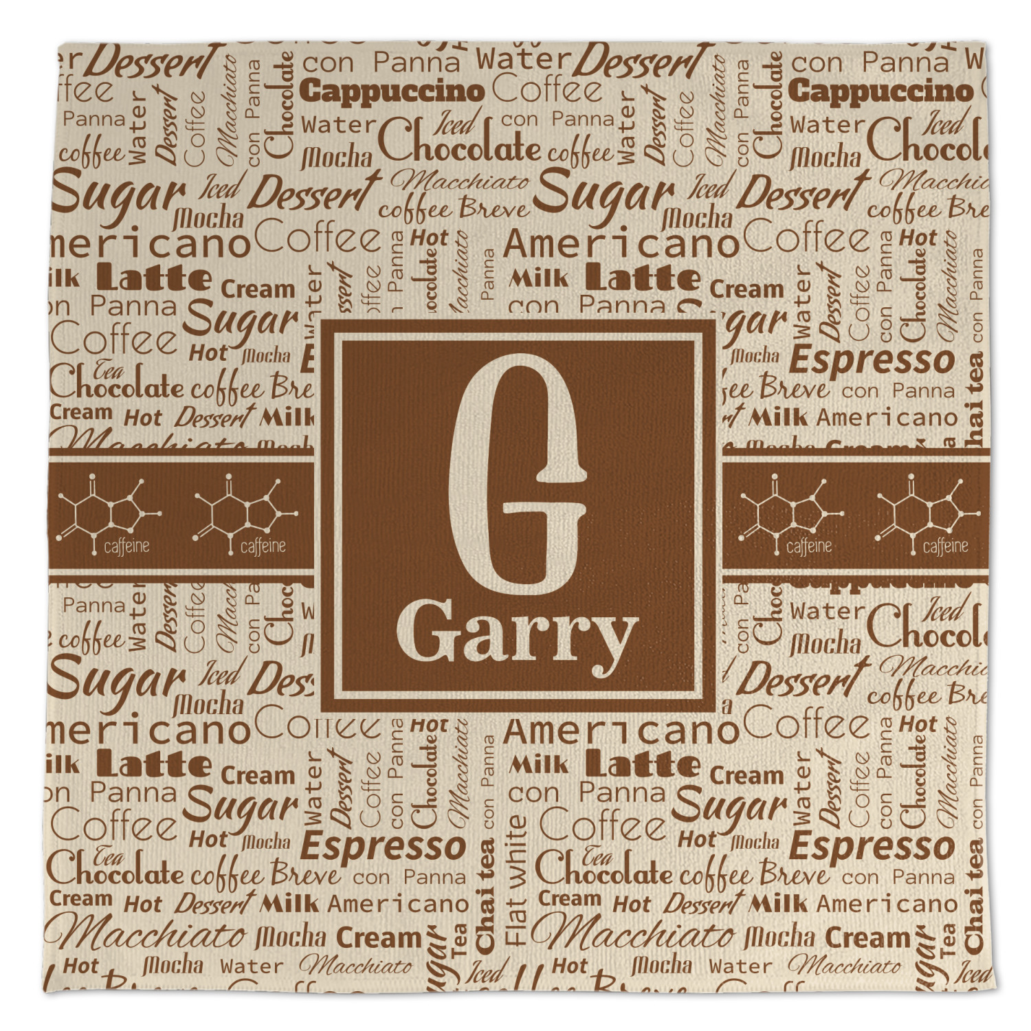 This design has a fun word cloud background with words like macchiato, sugar, coffee, latte, americano, and more. The colors are a light cream and chocolate brown. In the center is a frame where you are able to add personalization. The ribbon behind the frame has the chemical symbol for caffiene.