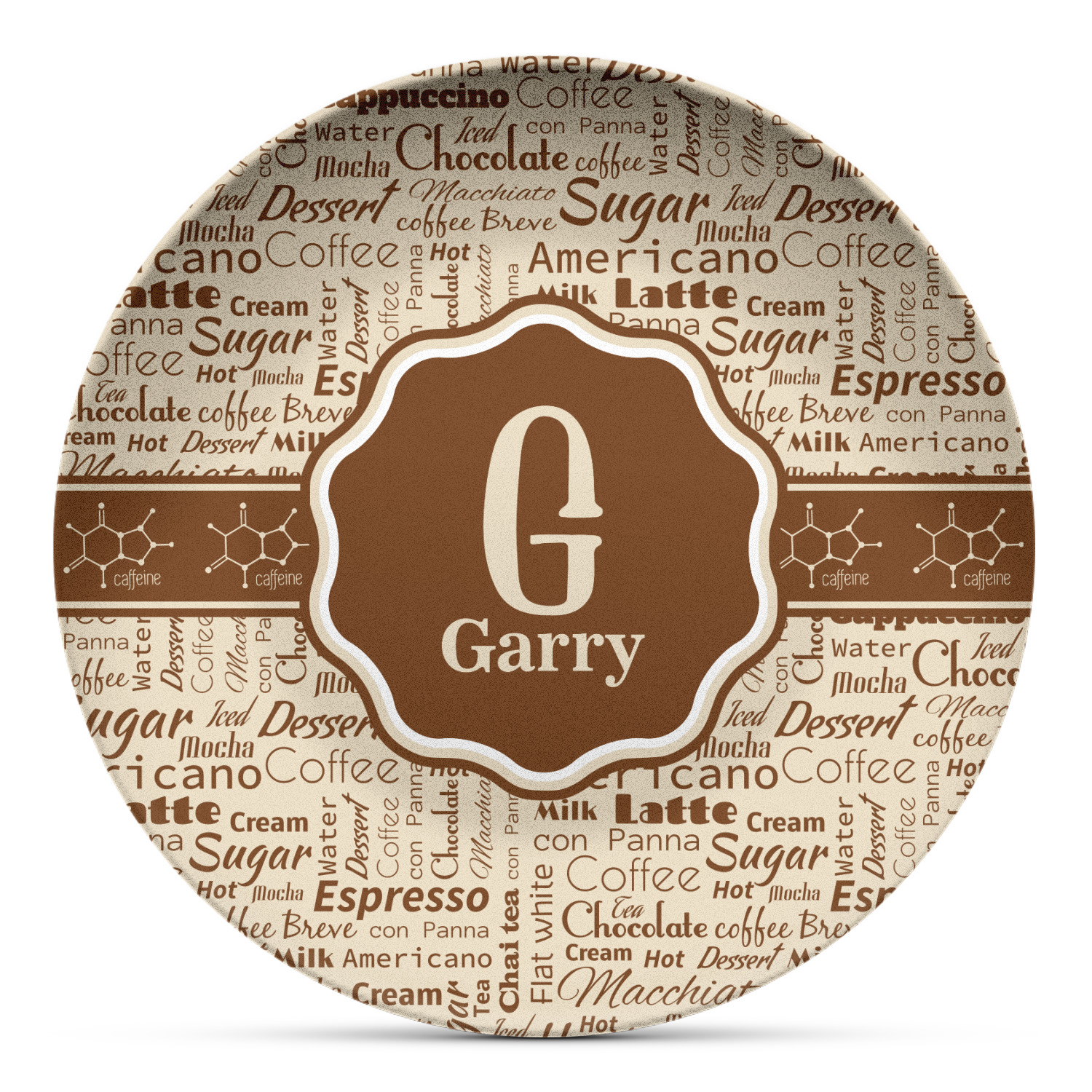 This design has a fun word cloud background with words like macchiato, sugar, coffee, latte, americano, and more. The colors are a light cream and chocolate brown. In the center is a frame where you are able to add personalization. The ribbon behind the frame has the chemical symbol for caffiene.