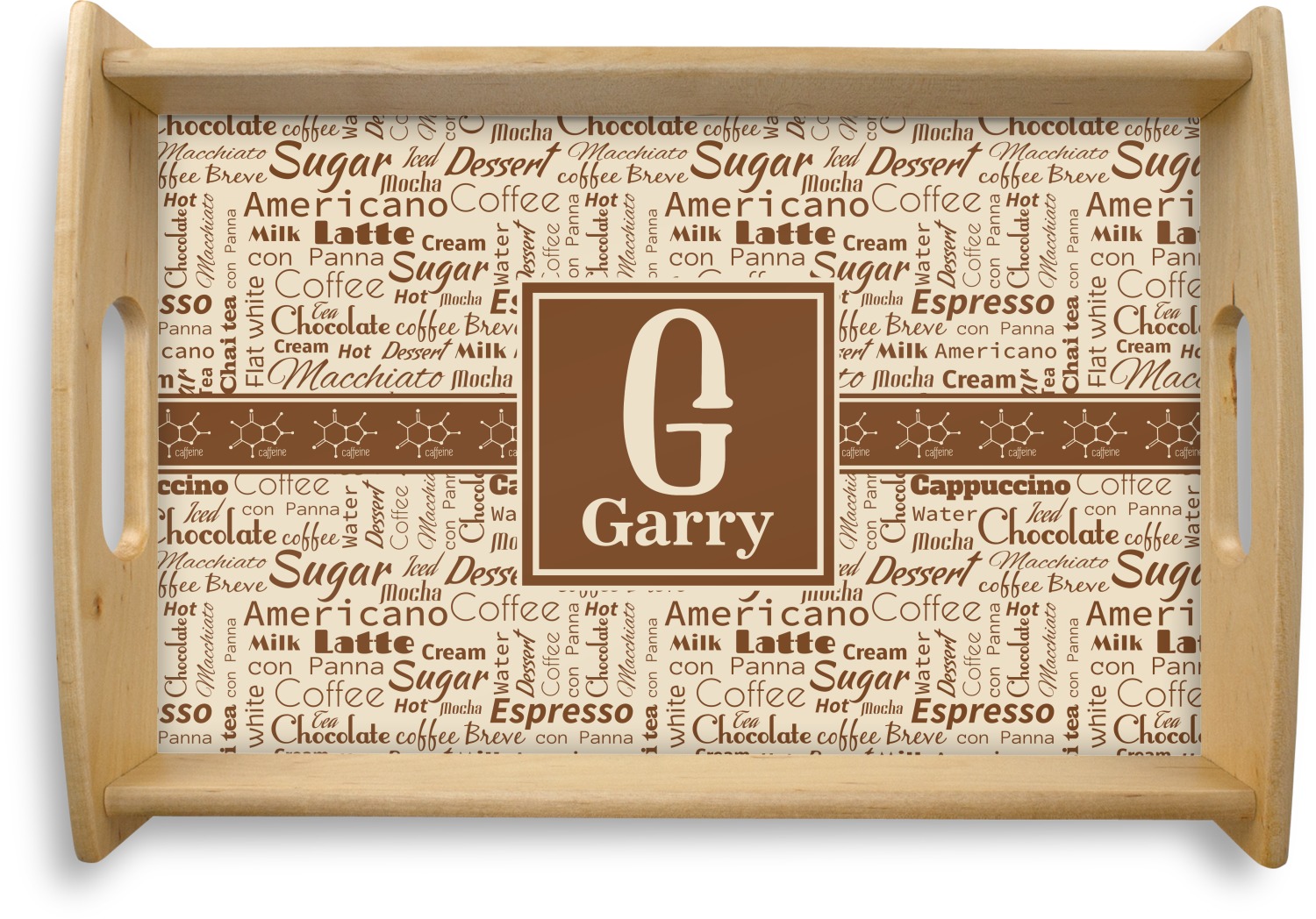 This serving tray with handles features square edges and two rounded sides, creating a very modern look. Each side is fabricated from a beautifully cut, natural wood. The bottom of the interior of the tray displays your customized design in bright, vibrant color. The tray is sold in both a black color and a natural wood look. Each variation of the wood serving tray has two sizes: Small, which is 14" x 10" x 2.25", and Large, which is 19.5" x 13.5" x 2.75".