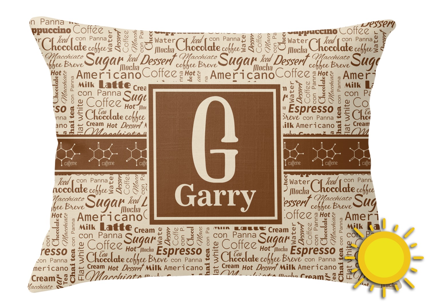This design has a fun word cloud background with words like macchiato, sugar, coffee, latte, americano, and more. The colors are a light cream and chocolate brown. In the center is a frame where you are able to add personalization. The ribbon behind the frame has the chemical symbol for caffiene.