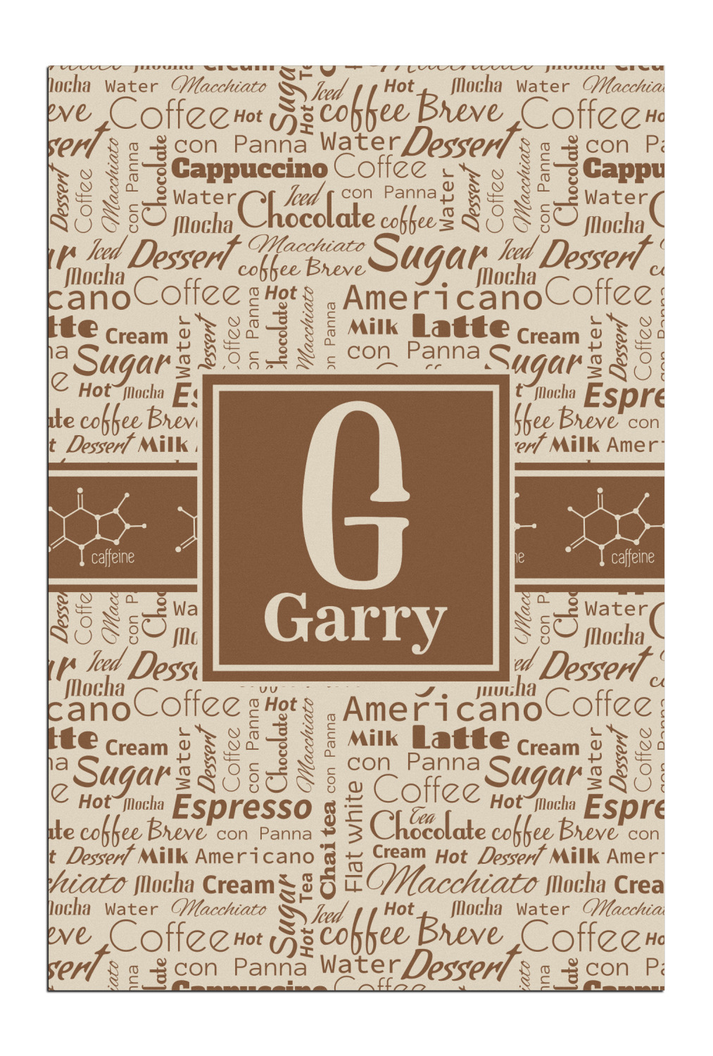 This design has a fun word cloud background with words like macchiato, sugar, coffee, latte, americano, and more. The colors are a light cream and chocolate brown. In the center is a frame where you are able to add personalization. The ribbon behind the frame has the chemical symbol for caffiene.