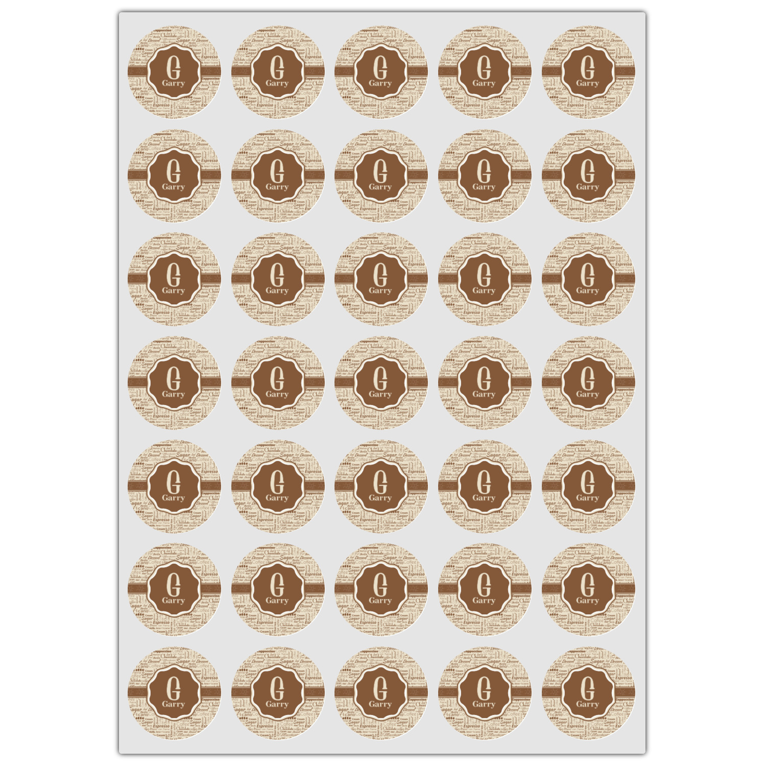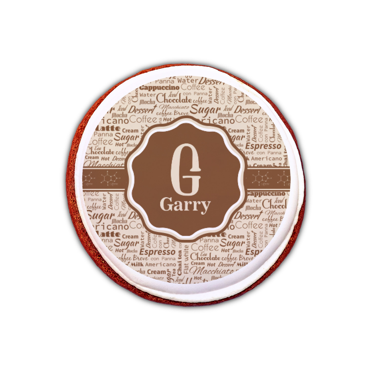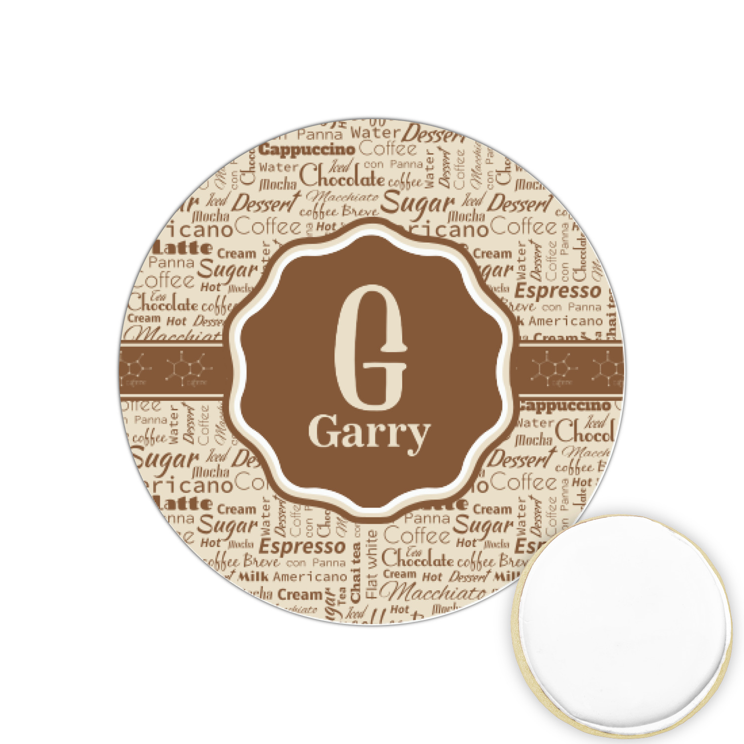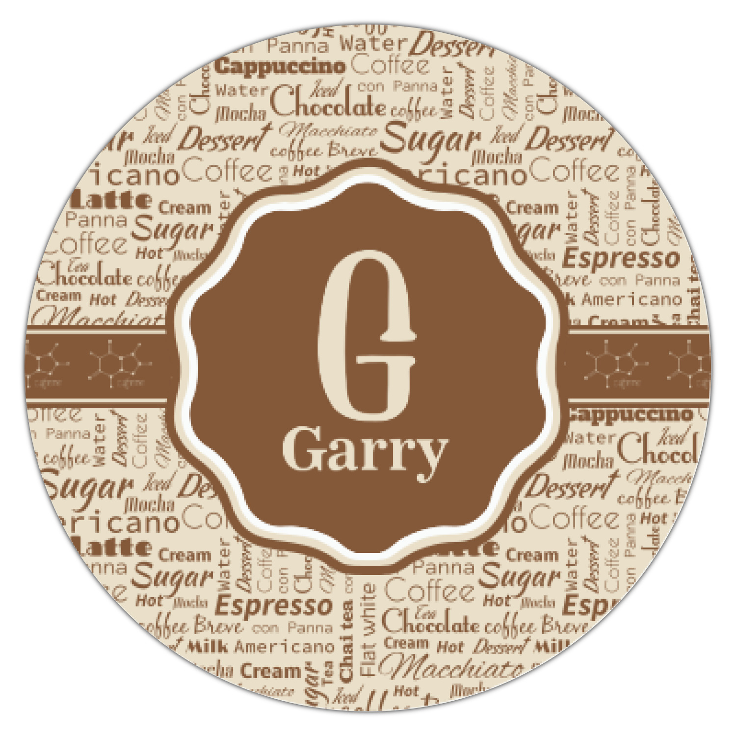 This design has a fun word cloud background with words like macchiato, sugar, coffee, latte, americano, and more. The colors are a light cream and chocolate brown. In the center is a frame where you are able to add personalization. The ribbon behind the frame has the chemical symbol for caffiene.