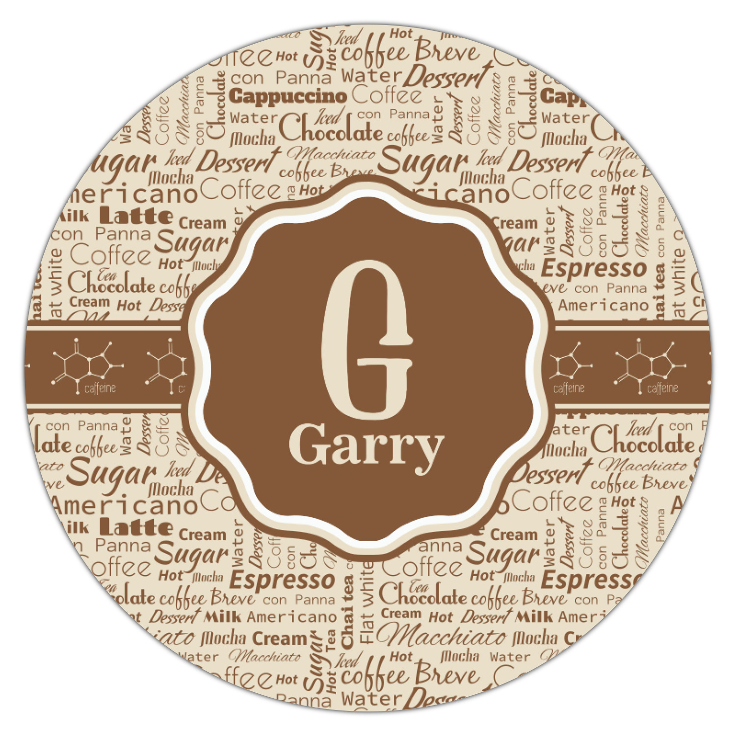 This design has a fun word cloud background with words like macchiato, sugar, coffee, latte, americano, and more. The colors are a light cream and chocolate brown. In the center is a frame where you are able to add personalization. The ribbon behind the frame has the chemical symbol for caffiene.