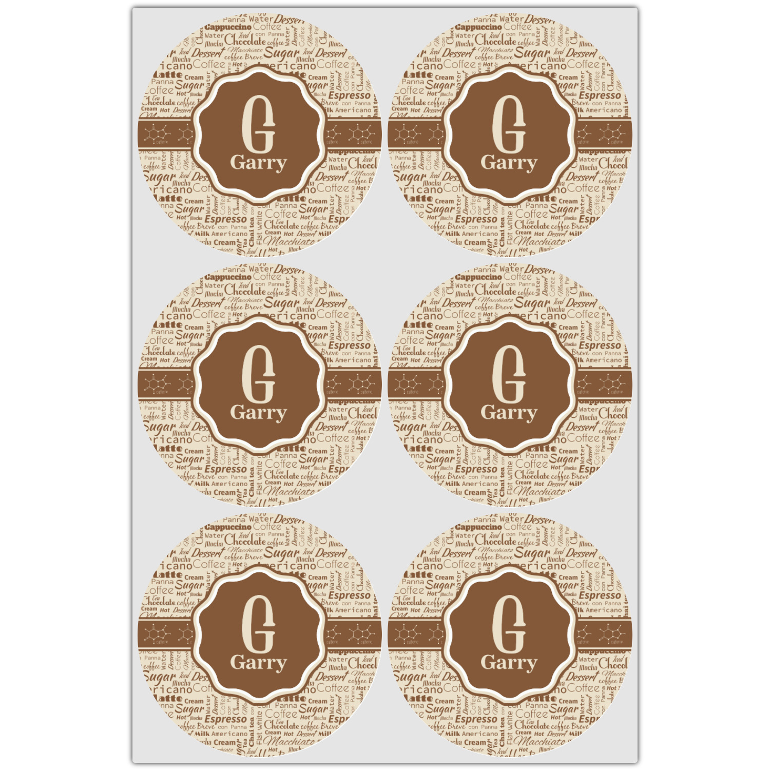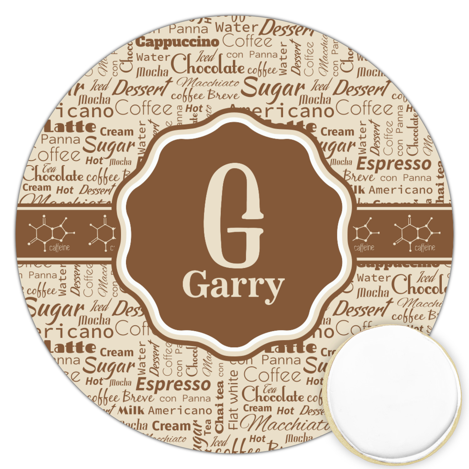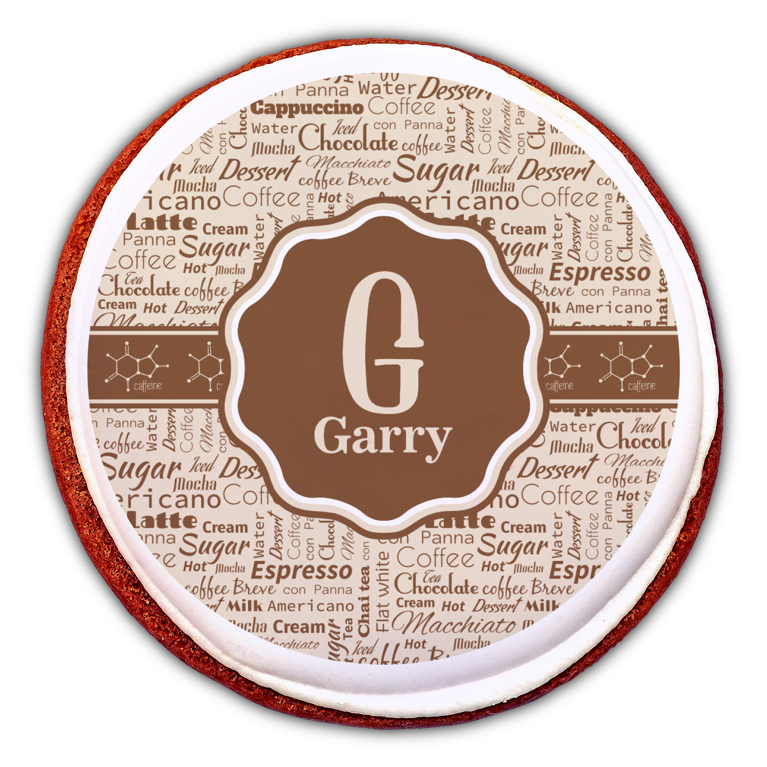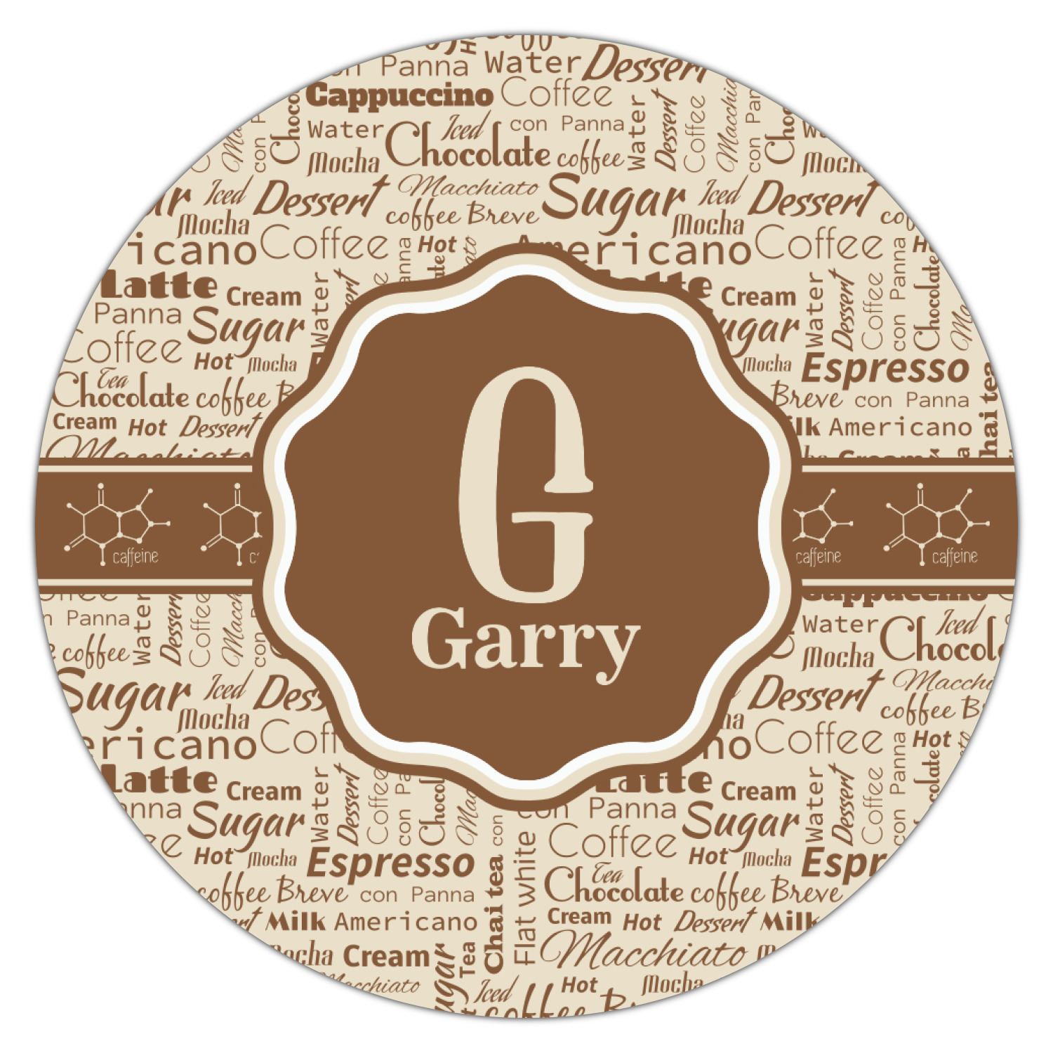 This design has a fun word cloud background with words like macchiato, sugar, coffee, latte, americano, and more. The colors are a light cream and chocolate brown. In the center is a frame where you are able to add personalization. The ribbon behind the frame has the chemical symbol for caffiene.