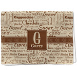 This design has a fun word cloud background with words like macchiato, sugar, coffee, latte, americano, and more. The colors are a light cream and chocolate brown. In the center is a frame where you are able to add personalization. The ribbon behind the frame has the chemical symbol for caffiene.