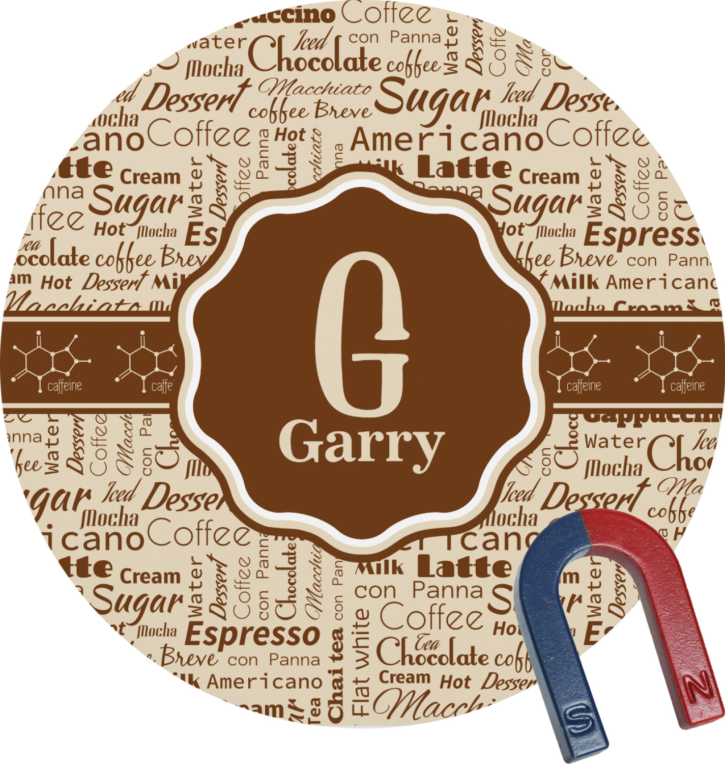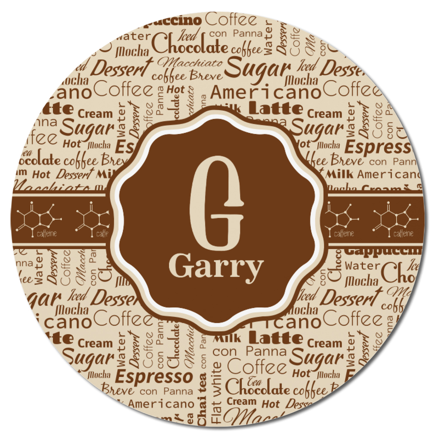 This design has a fun word cloud background with words like macchiato, sugar, coffee, latte, americano, and more. The colors are a light cream and chocolate brown. In the center is a frame where you are able to add personalization. The ribbon behind the frame has the chemical symbol for caffiene.