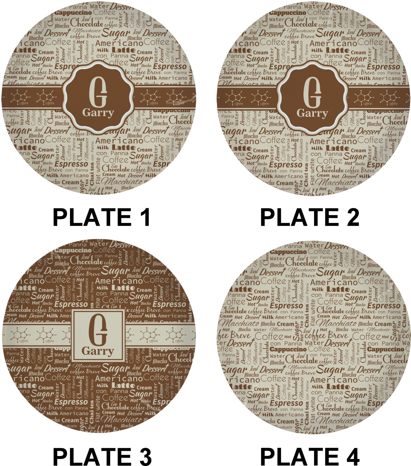 This design has a fun word cloud background with words like macchiato, sugar, coffee, latte, americano, and more. The colors are a light cream and chocolate brown. In the center is a frame where you are able to add personalization. The ribbon behind the frame has the chemical symbol for caffiene.