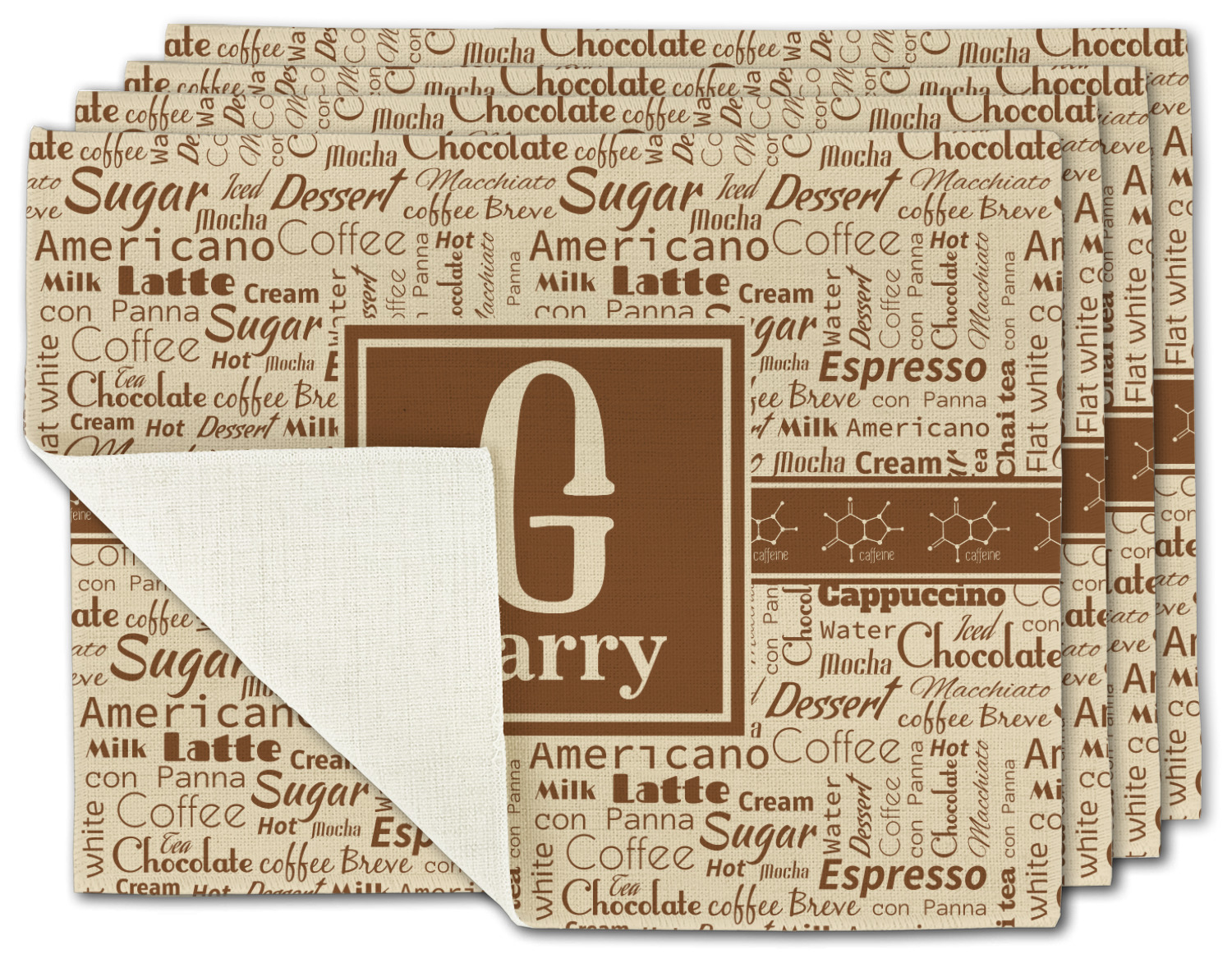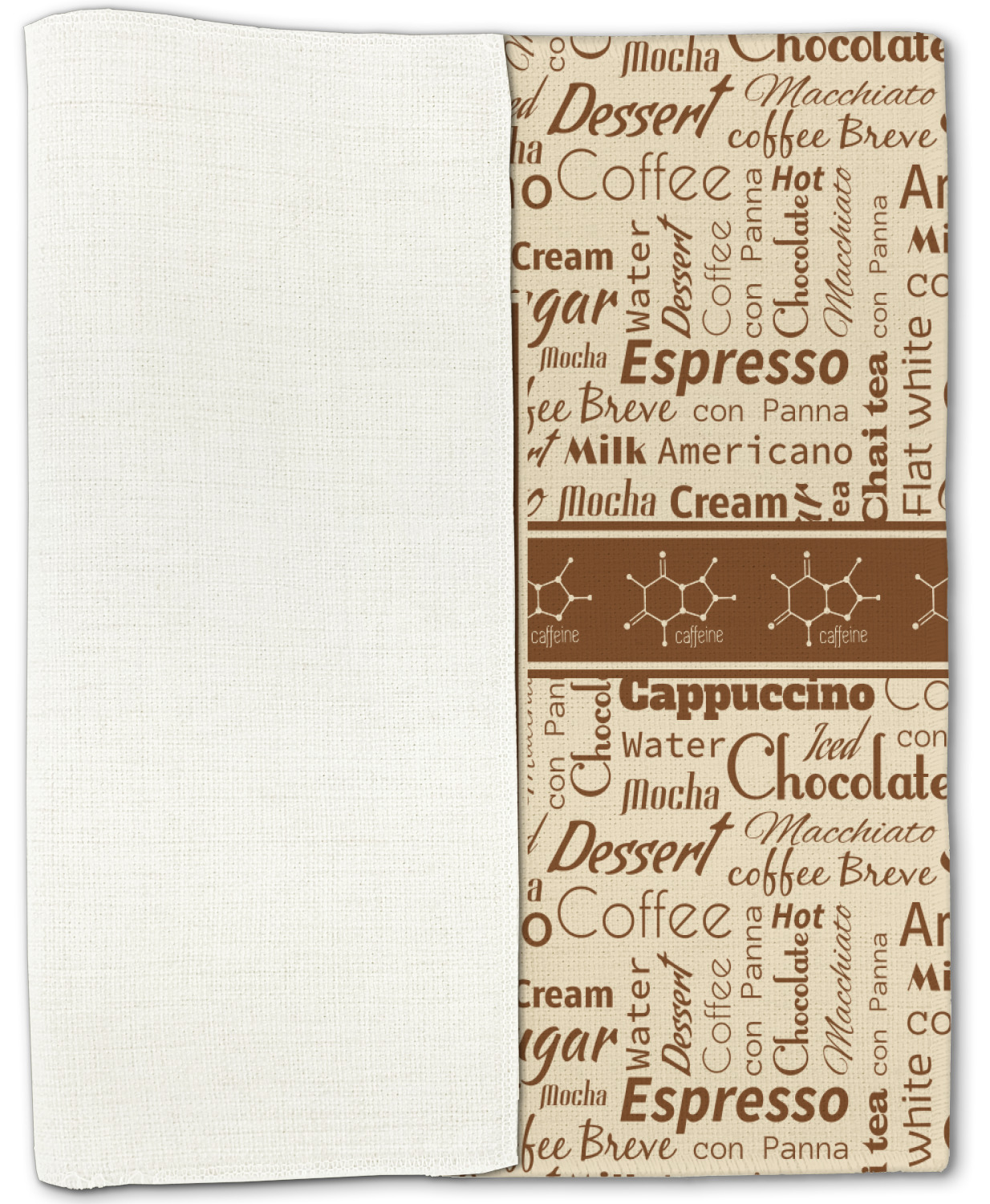 This design has a fun word cloud background with words like macchiato, sugar, coffee, latte, americano, and more. The colors are a light cream and chocolate brown. In the center is a frame where you are able to add personalization. The ribbon behind the frame has the chemical symbol for caffiene.