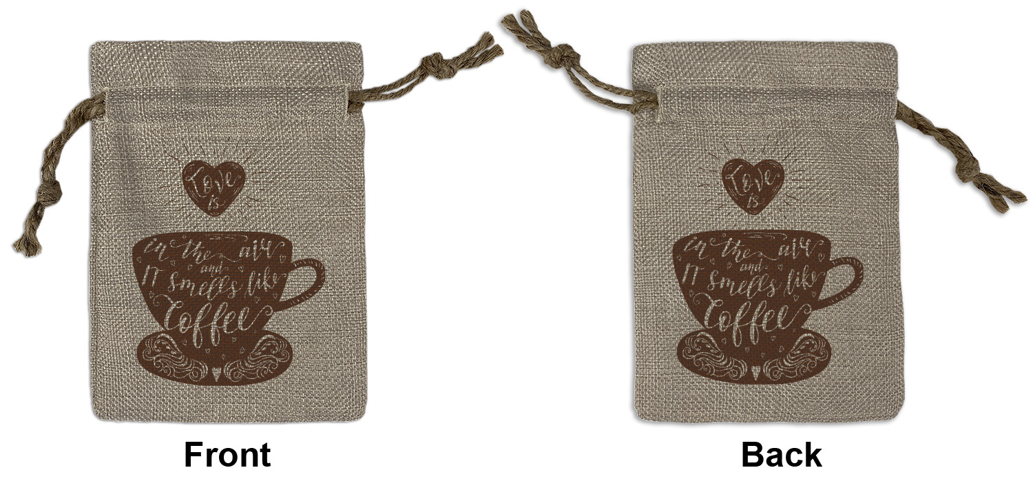 We sell our Burlap Gift Bags in 3 variant sized bags. Made with burlap polyester, each personalized bag can be secured with a twine drawstring pull. Your custom design is available to print on one side or both sides - completely up to you! The sizes of the bags measure approximately 4.5" x 6.5" for the smallest size, 6.5" x 8.0" for the medium size, and 6.5" x 13.5" for the large-sized bag.