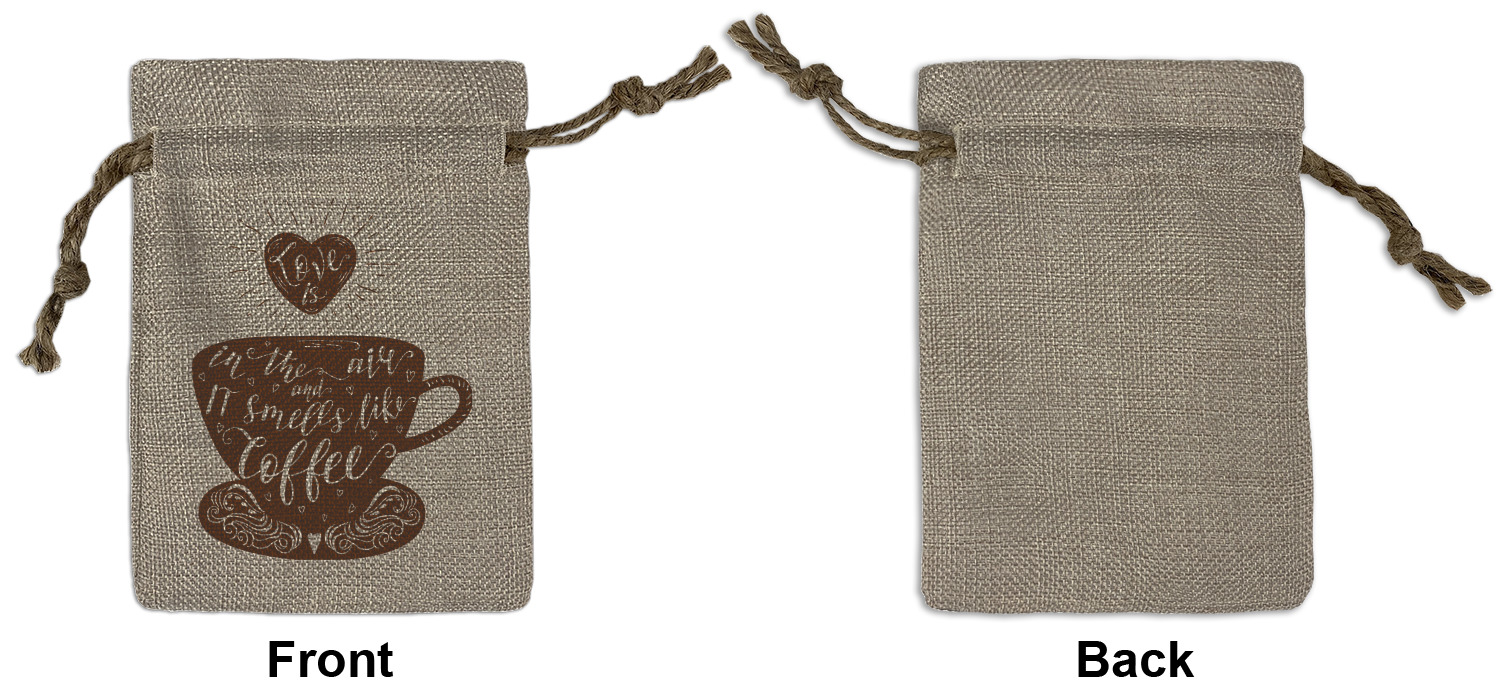 We sell our Burlap Gift Bags in 3 variant sized bags. Made with burlap polyester, each personalized bag can be secured with a twine drawstring pull. Your custom design is available to print on one side or both sides - completely up to you! The sizes of the bags measure approximately 4.5" x 6.5" for the smallest size, 6.5" x 8.0" for the medium size, and 6.5" x 13.5" for the large-sized bag.