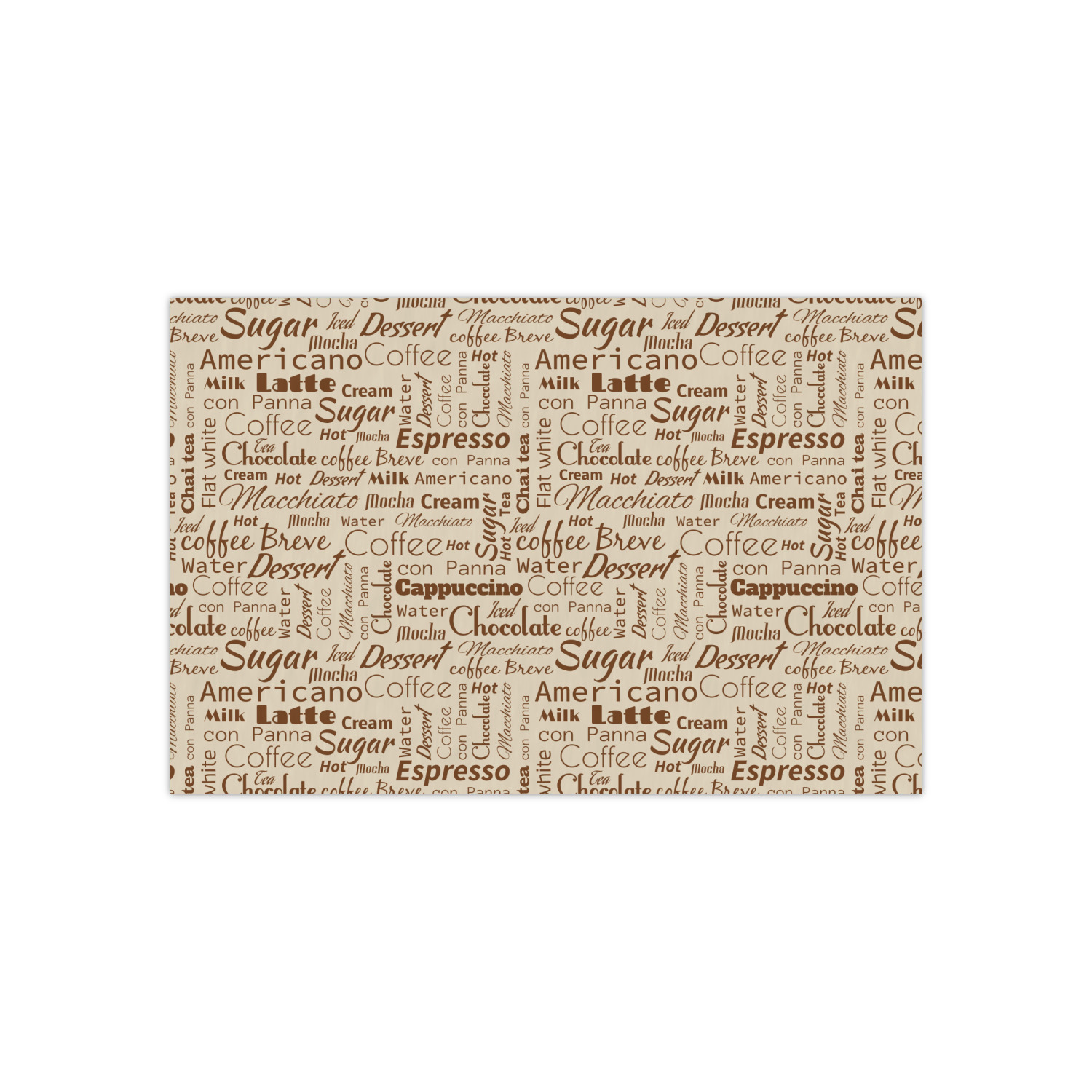 This design has a fun word cloud background with words like macchiato, sugar, coffee, latte, americano, and more. The colors are a light cream and chocolate brown. In the center is a frame where you are able to add personalization. The ribbon behind the frame has the chemical symbol for caffiene.