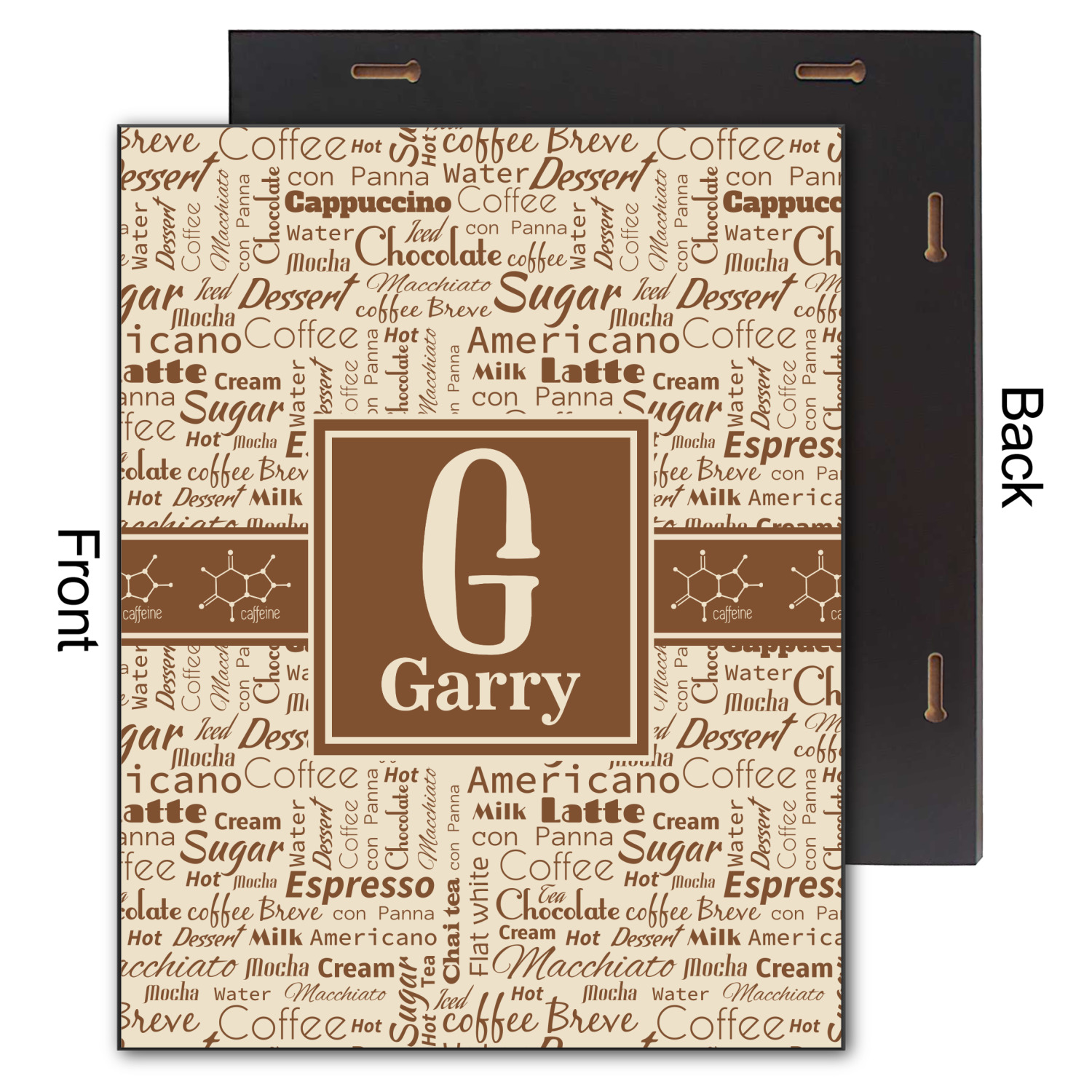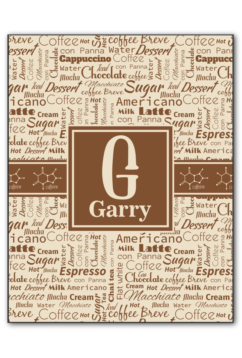 This design has a fun word cloud background with words like macchiato, sugar, coffee, latte, americano, and more. The colors are a light cream and chocolate brown. In the center is a frame where you are able to add personalization. The ribbon behind the frame has the chemical symbol for caffiene.