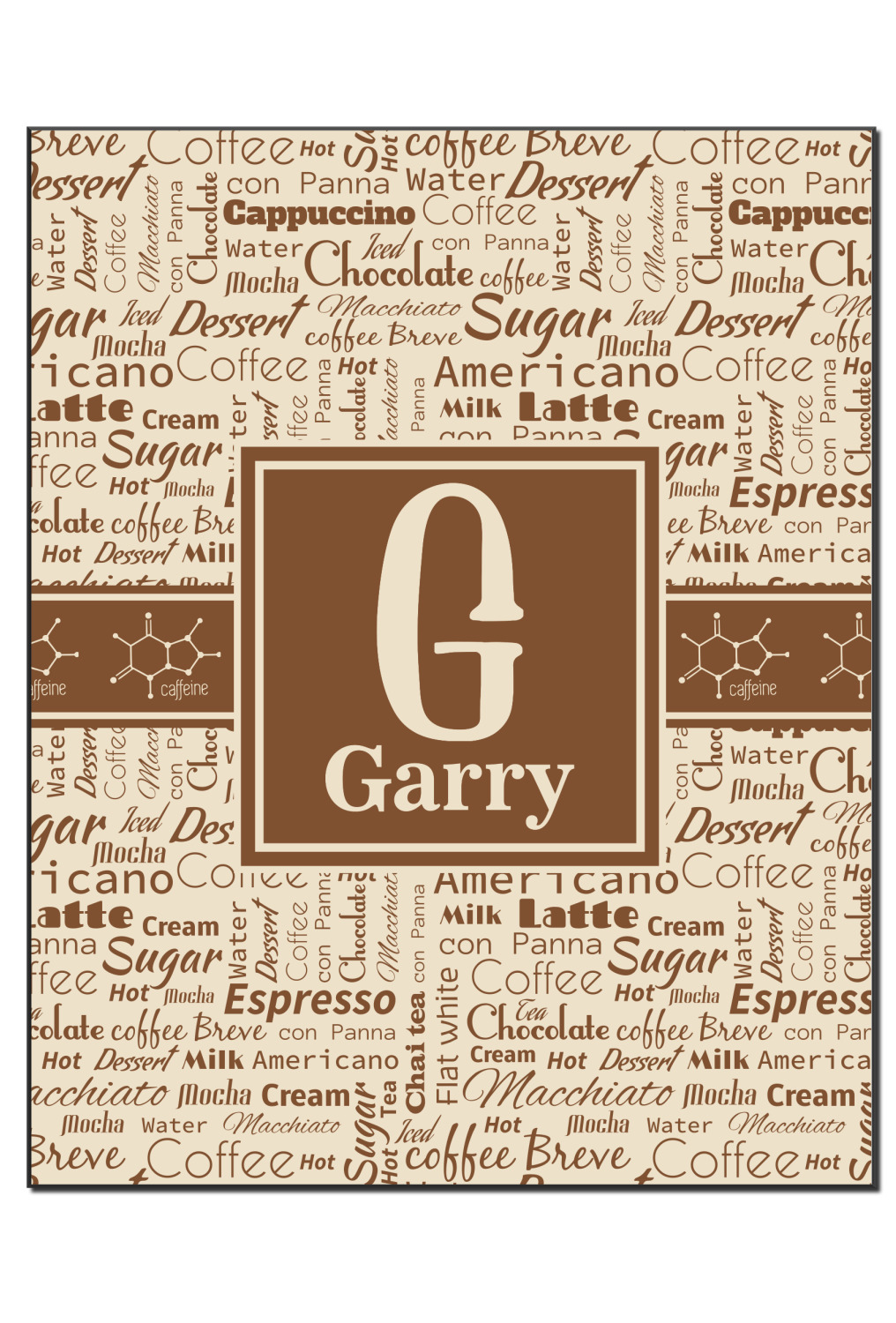 This design has a fun word cloud background with words like macchiato, sugar, coffee, latte, americano, and more. The colors are a light cream and chocolate brown. In the center is a frame where you are able to add personalization. The ribbon behind the frame has the chemical symbol for caffiene.
