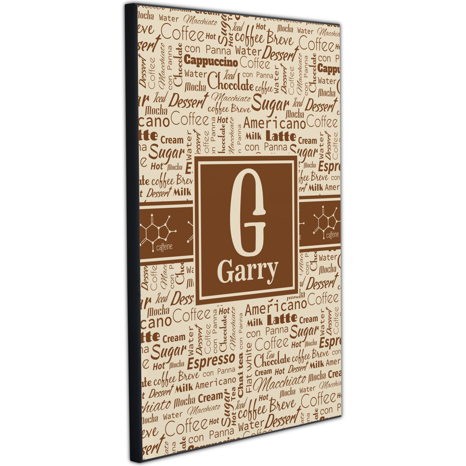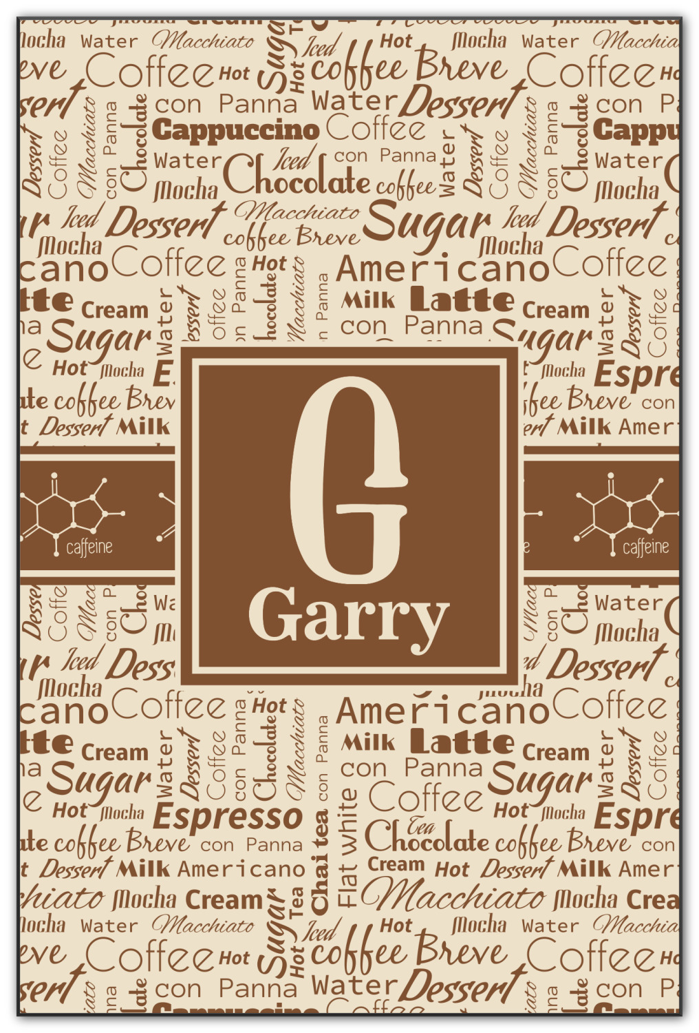 This design has a fun word cloud background with words like macchiato, sugar, coffee, latte, americano, and more. The colors are a light cream and chocolate brown. In the center is a frame where you are able to add personalization. The ribbon behind the frame has the chemical symbol for caffiene.
